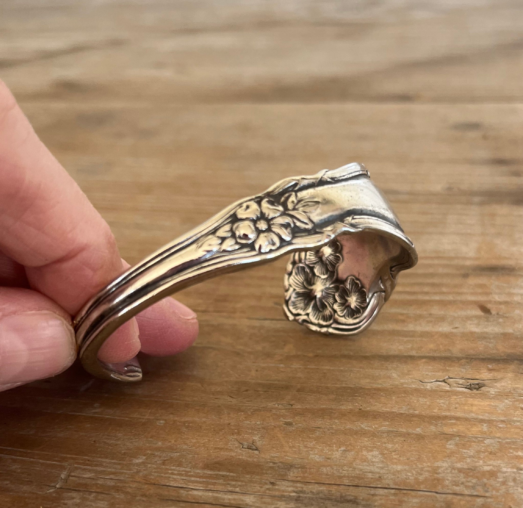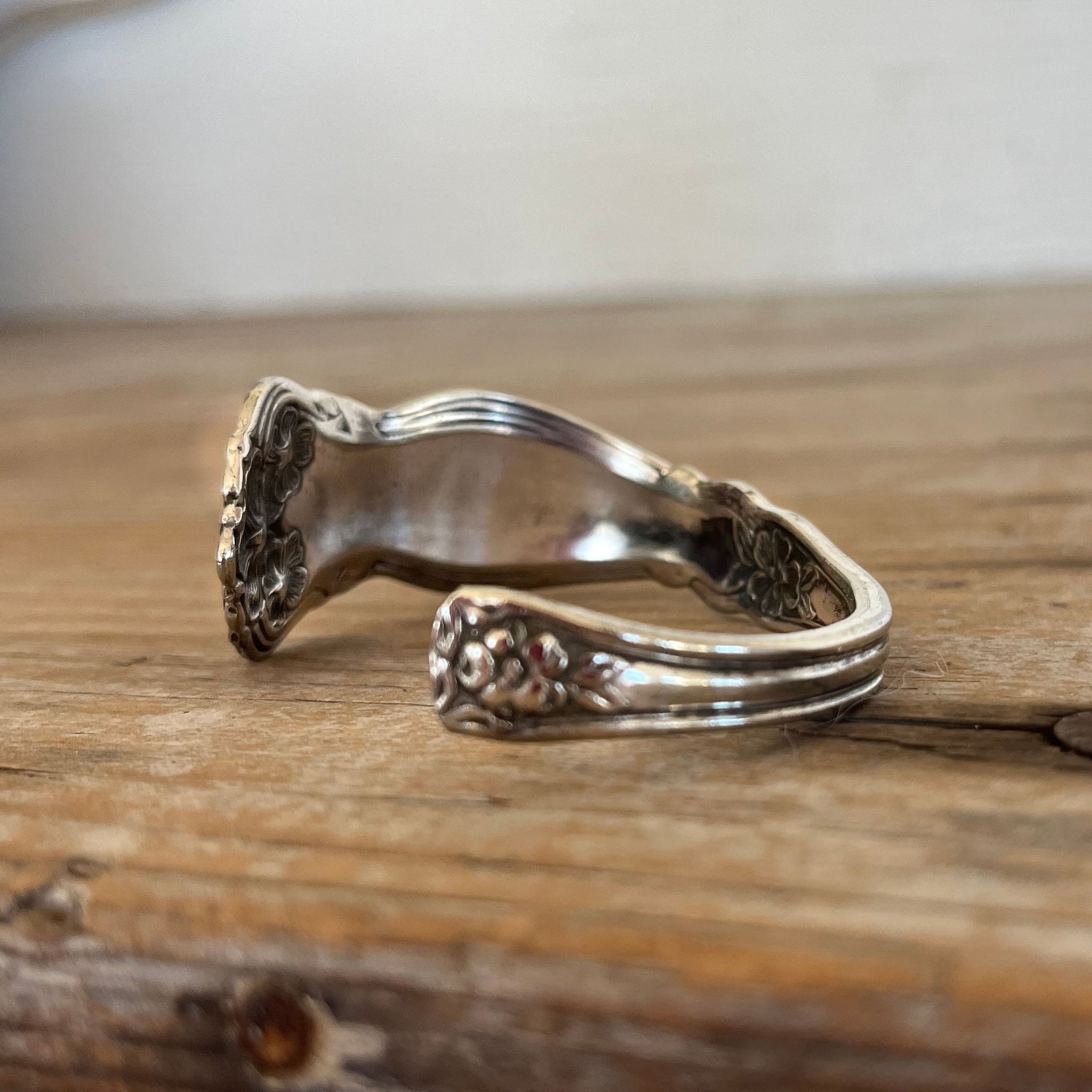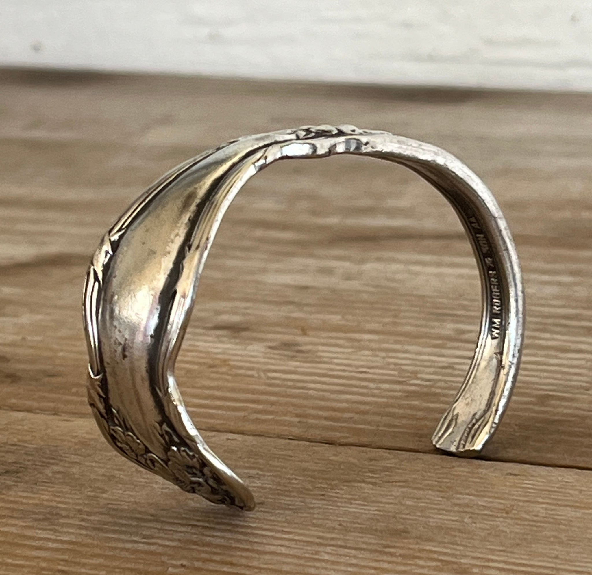 This cuff bracelet is crafted from a vintage silver-plated spoon in the Arbutus pattern—a design inspired by the evergreen arbutus tree, known for its smooth red bark, bell-shaped blossoms, and quiet resilience. The pattern embodies soft curves, organic lines, and a sense of movement that feels like nature mid-bloom.