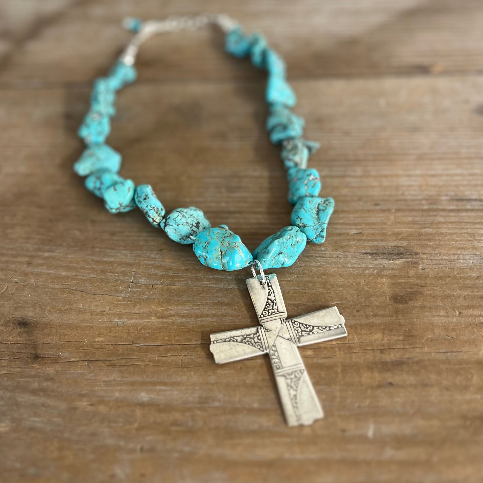 The pendant is pure originality: four vintage silverware handles, cut, prepped, and married together into a striking cross. No molds, no replicas—just authentic hand‑worked artistry.