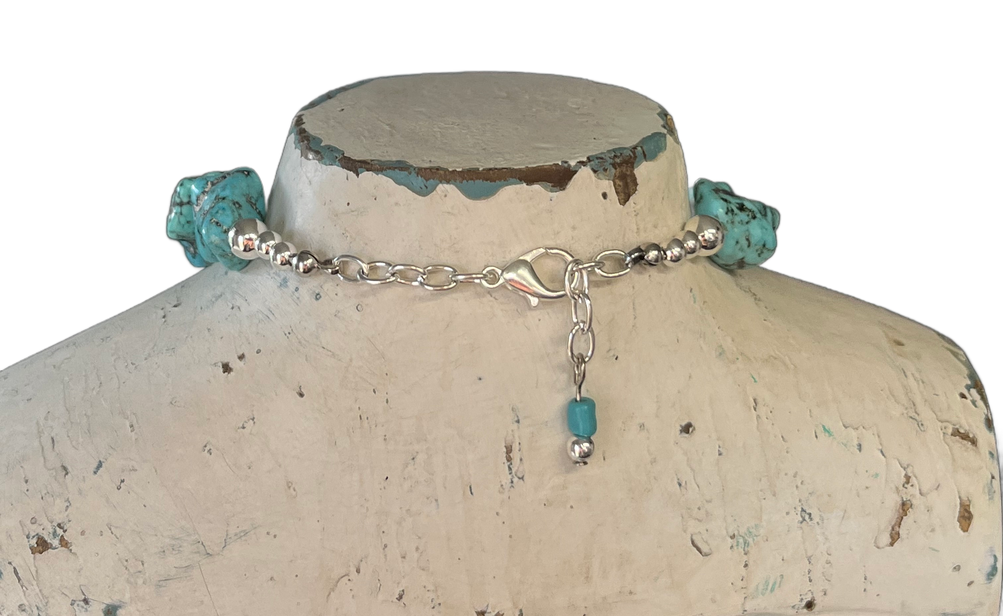 The necklace itself is strung with chunky turquoise howlite spheres, accented by 6mm and 4mm silverplate beads, all finished with a silverplate link chain. Extra beads adorn the chain, giving you flexibility to clasp it at the length that feels just right.