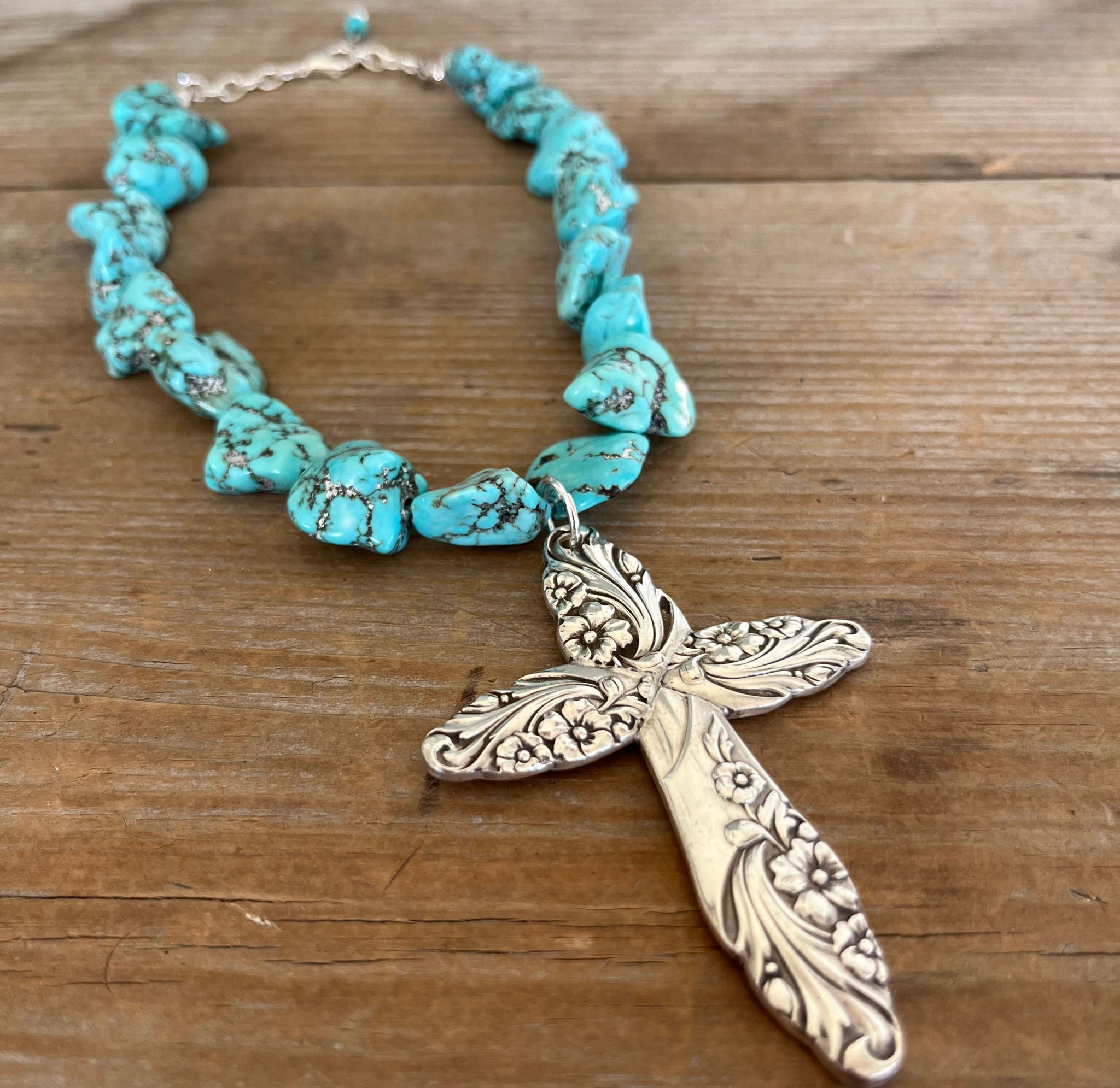 Why settle for blending in when you can be the star of the show? This necklace doesn’t just accessorize—it upstages. Chunky turquoise howlite stones bring the drama, while a cross made from four vintage spoon handles (yes, spoon handles!) steals the spotlight. Cut, prepped, and married into one bold form, the pendant flaunts the Evening Star pattern like it was born to shine.