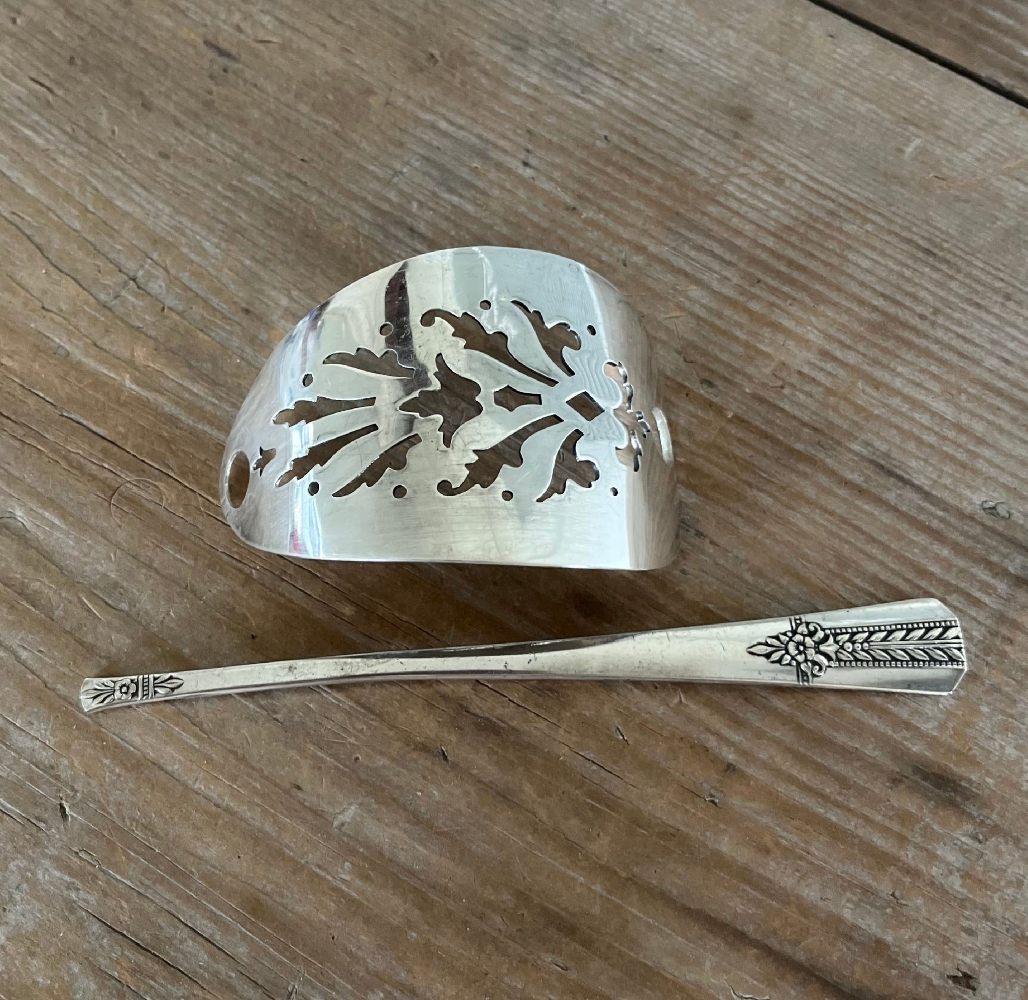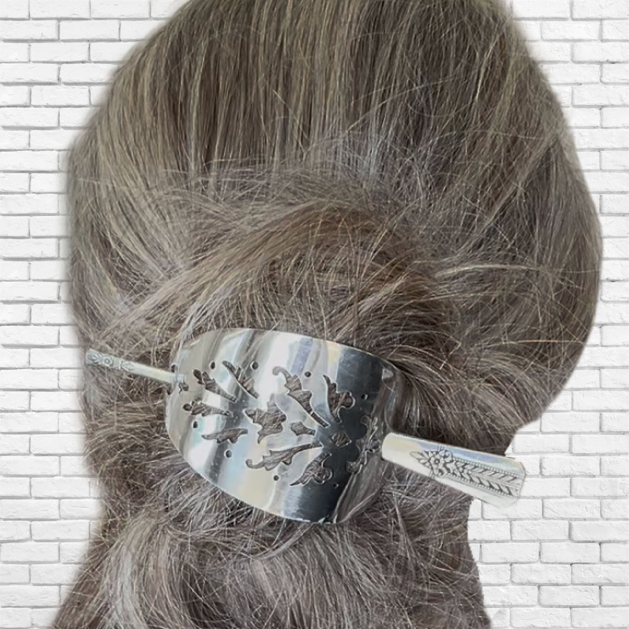 This unique hair accessory began as a vintage cake server, bent into a smooth crescent shape. Paired with a stick made from an iced tea spoon, it’s both functional and full of character. The punched design adds visual interest while allowing your hair to shine through.