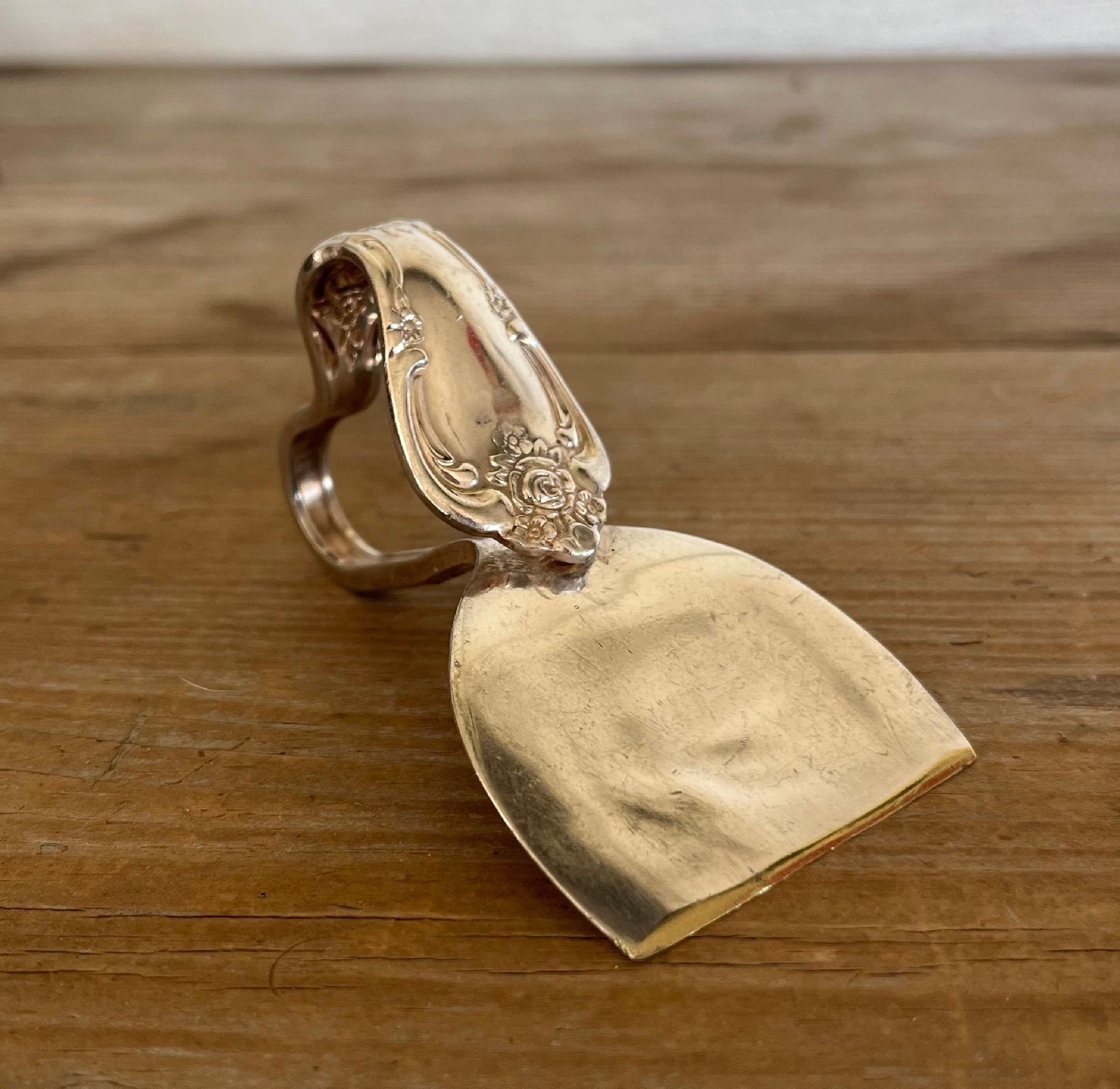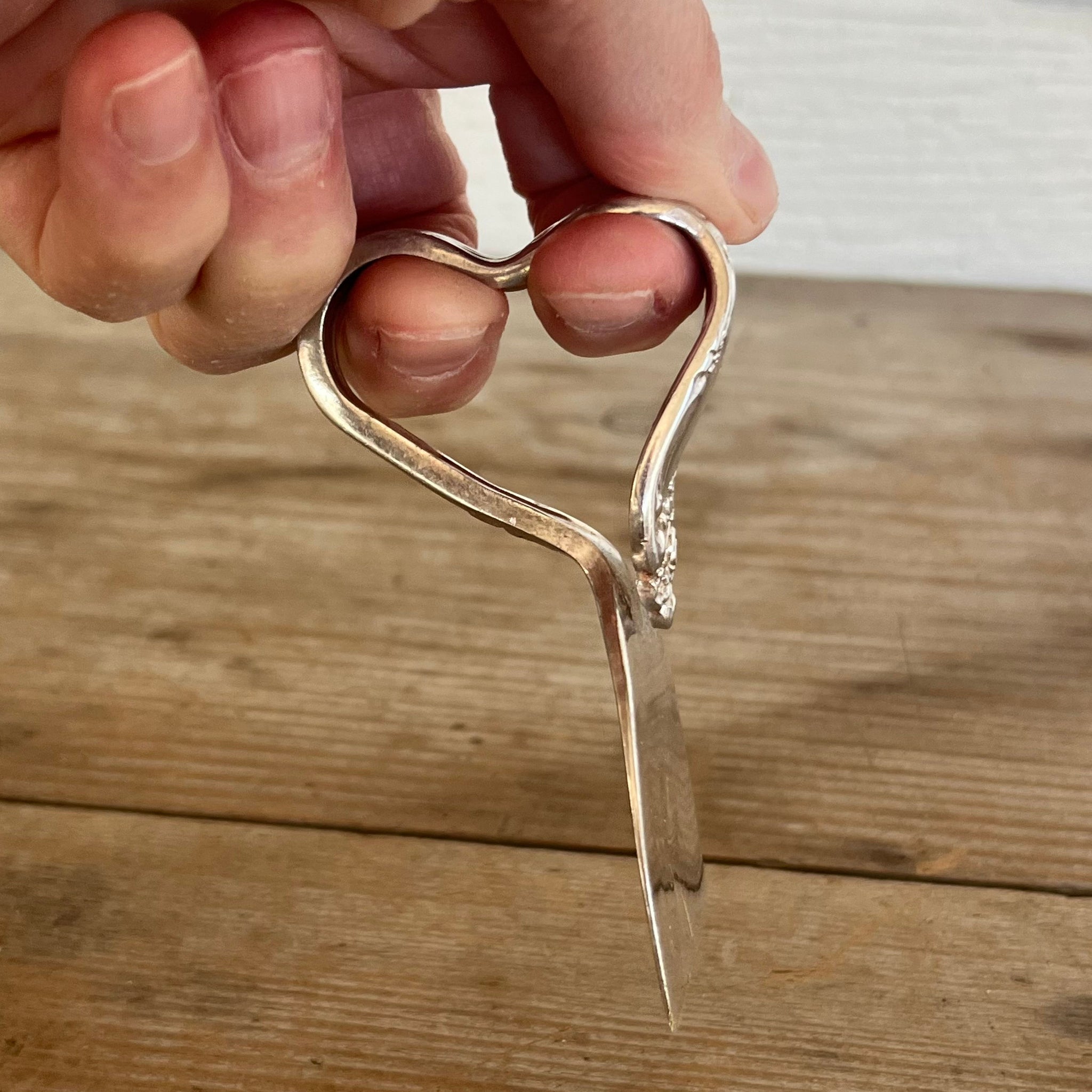 HANDcrafted from an upcycled vintage serving spoon, this charcuterie knife embodies uniqueness and sustainability. Its heart-shaped handle, featuring thoughtfully placed indents, is ergonomically designed to fit comfortably in your fingers. This design allows for direct downward force, making the task of cutting hard cheeses safer, easier, and more efficient.