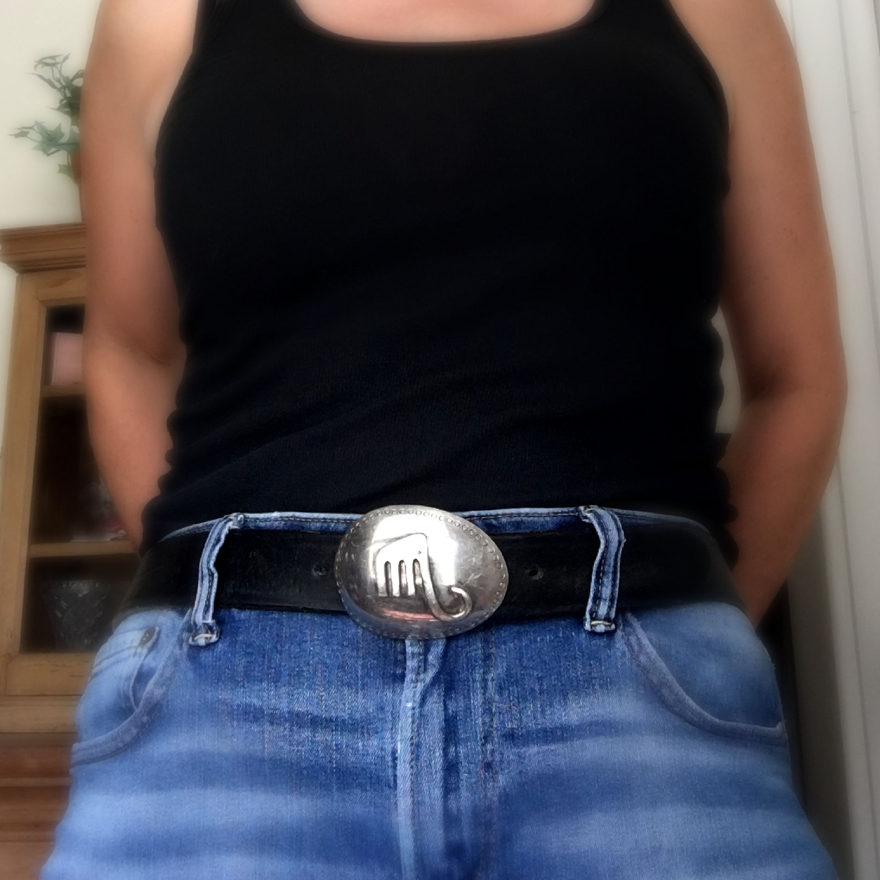Our upcycled spoon belt buckles are handcrafted from authentic vintage silverplate and reclaimed silverware, shaped by hand into bold, sculptural designs that highlight the original patterns and character of the metal.
