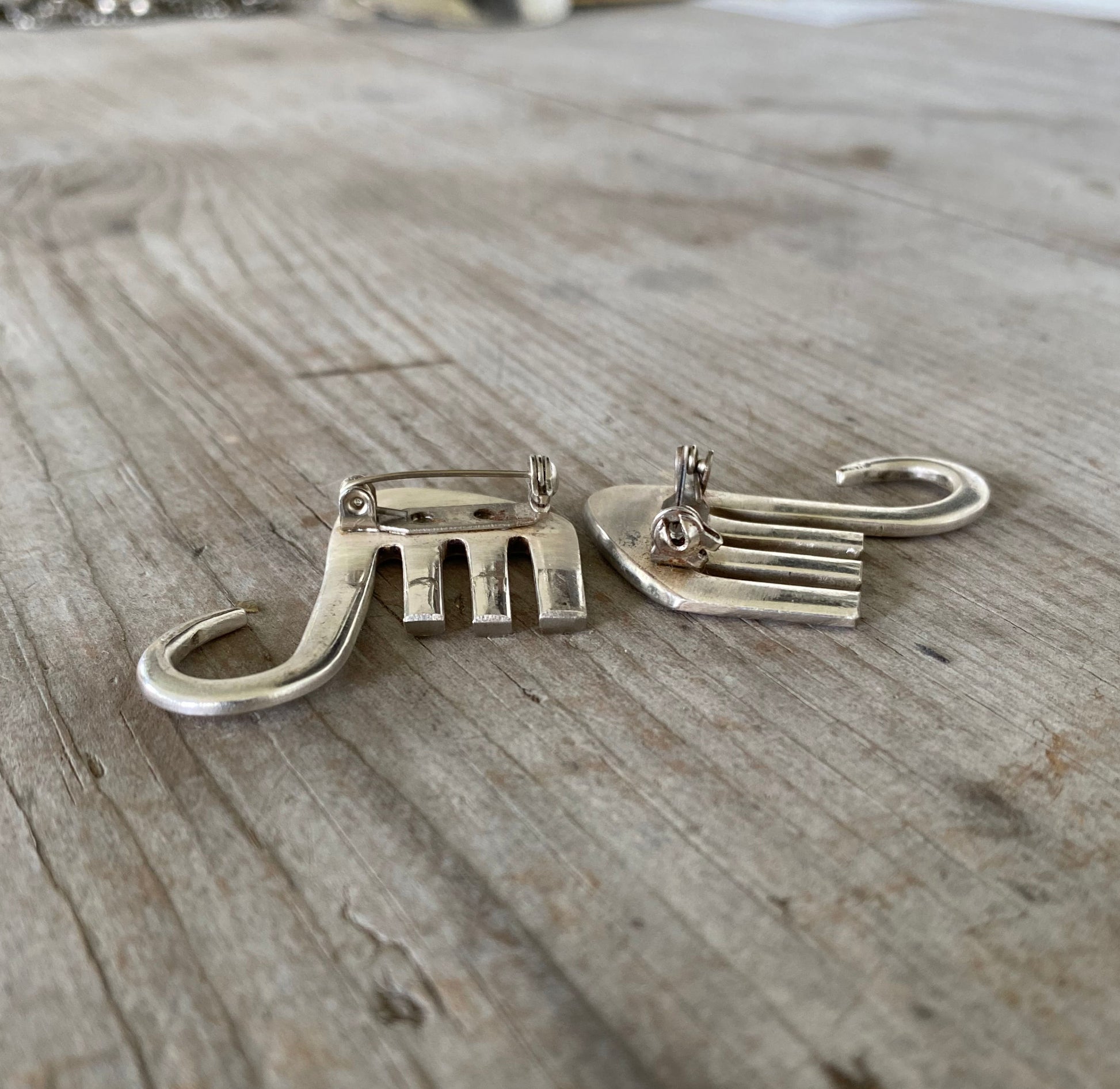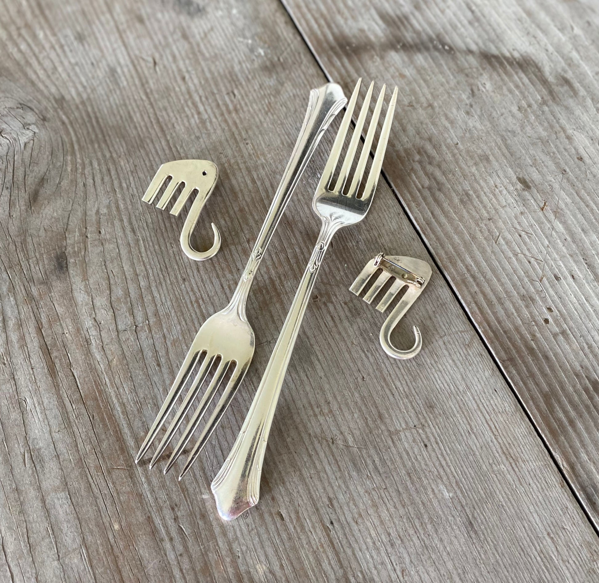 Our sweet elephant pins are made from upcycled vintage silverplate forks. They are made from various patterns and have a stainless steel safety catch pinback on the underneath side.
