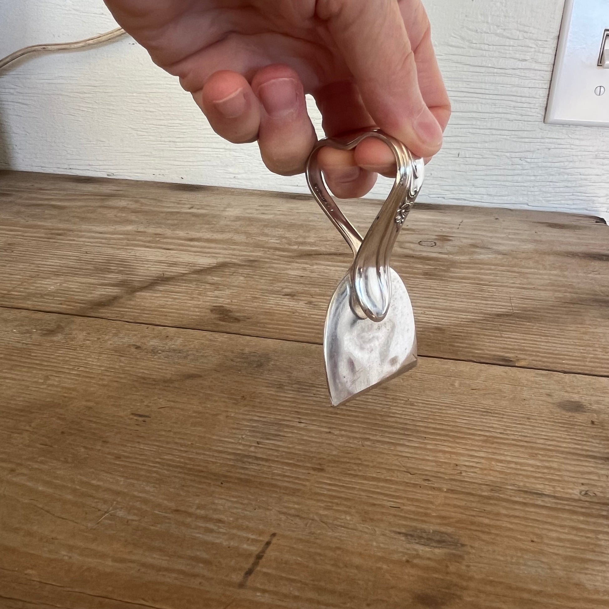 HANDcrafted from an upcycled vintage serving spoon, this charcuterie knife embodies uniqueness and sustainability. Its heart-shaped handle, featuring thoughtfully placed indents, is ergonomically designed to fit comfortably in your fingers. This design allows for direct downward force, making the task of cutting hard cheeses safer, easier, and more efficient.