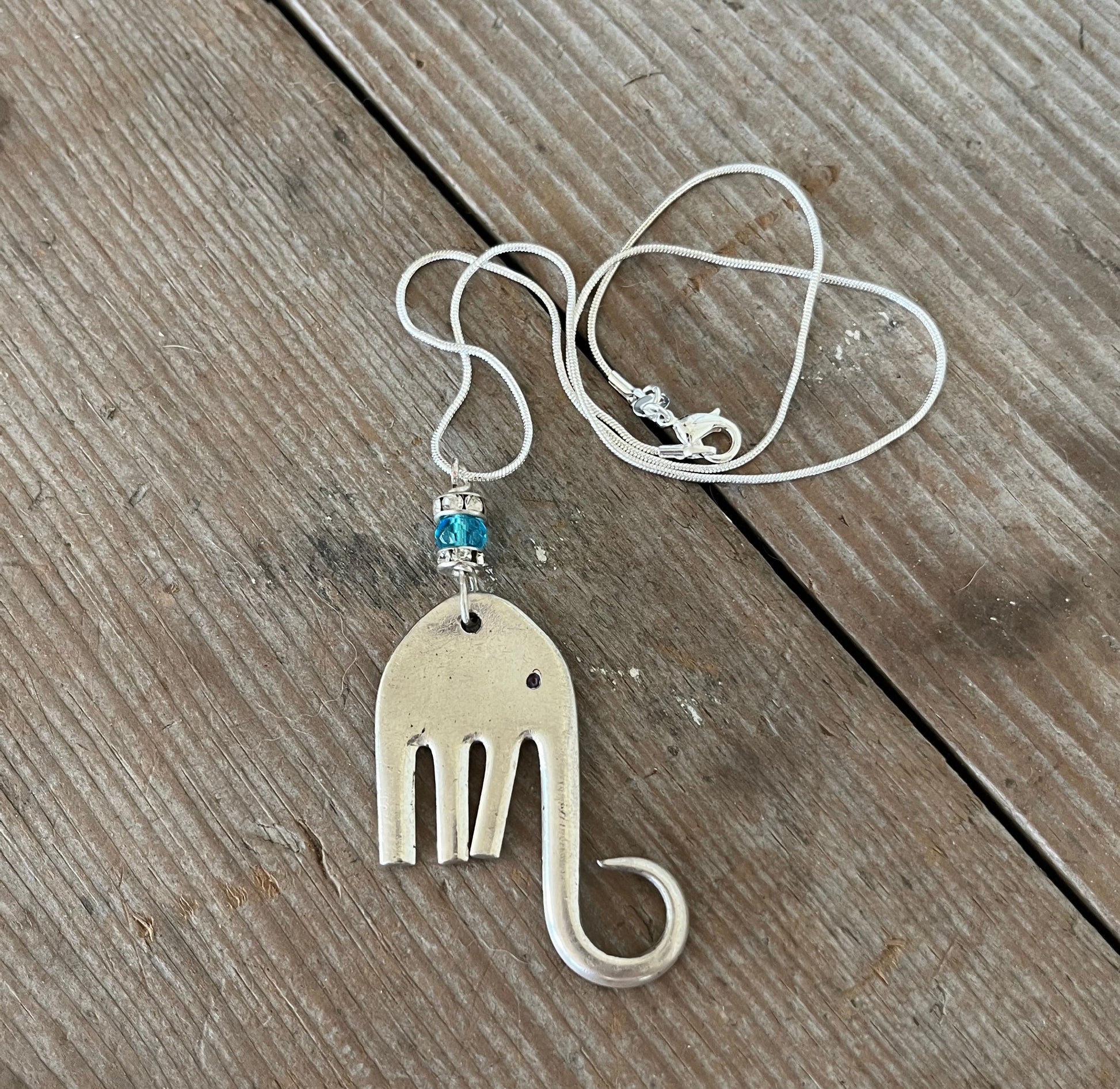 An upcycled silverware necklace is created from a vintage silverplate fork. These fork elephants are a customer favorite!