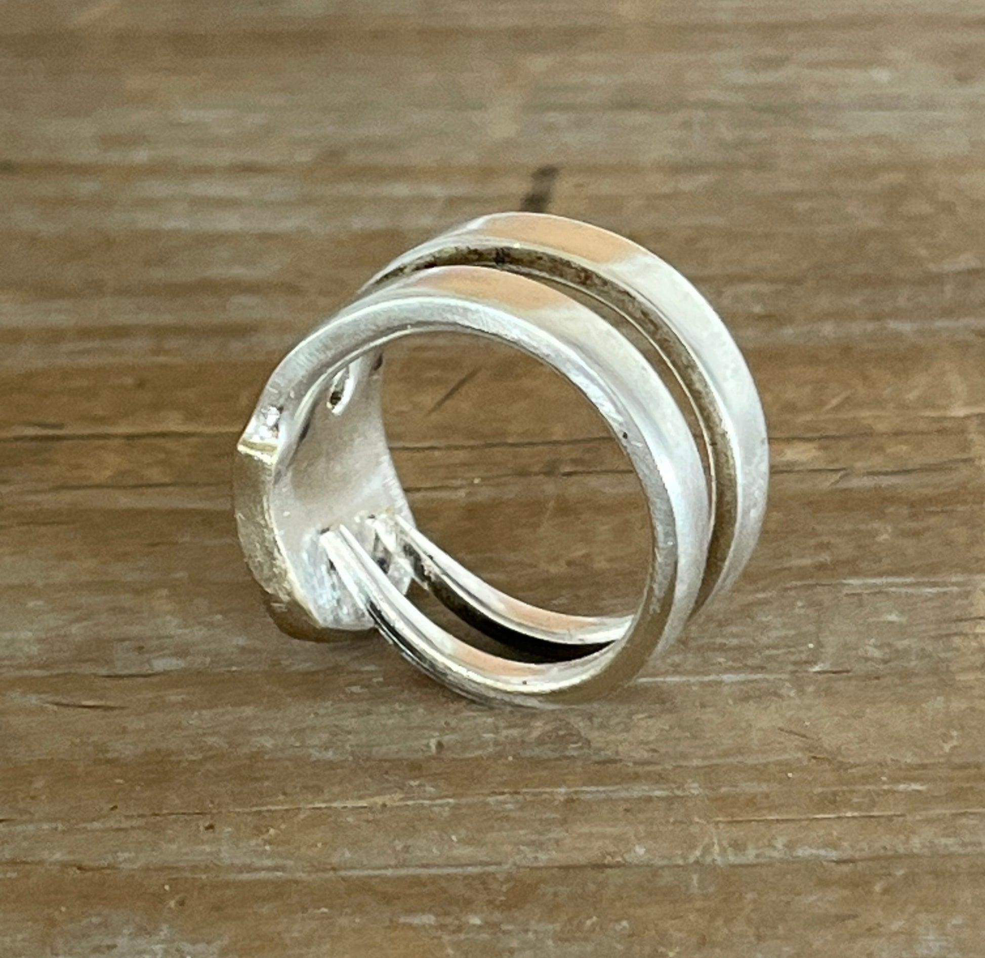 The handle’s off living its own adventure, so we can’t name the pattern, but the silverplate is in excellent shape and the vibe is unmistakably Laughing Frog: soulful, sustainable, and a little bit sassy. Bonus: two of the original tines were snipped off and turned into another ring, because we believe in second chances and double trouble.