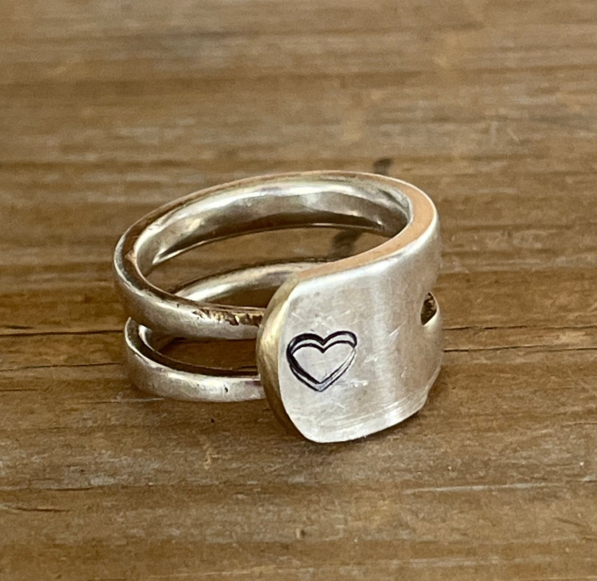 Forks were made for eating—until this little rebel came along. This upcycled silverware ring was once the business end of a vintage fork, now bent into a bold, modern band and hand-stamped with a heart that says, “I love breaking the rules.”