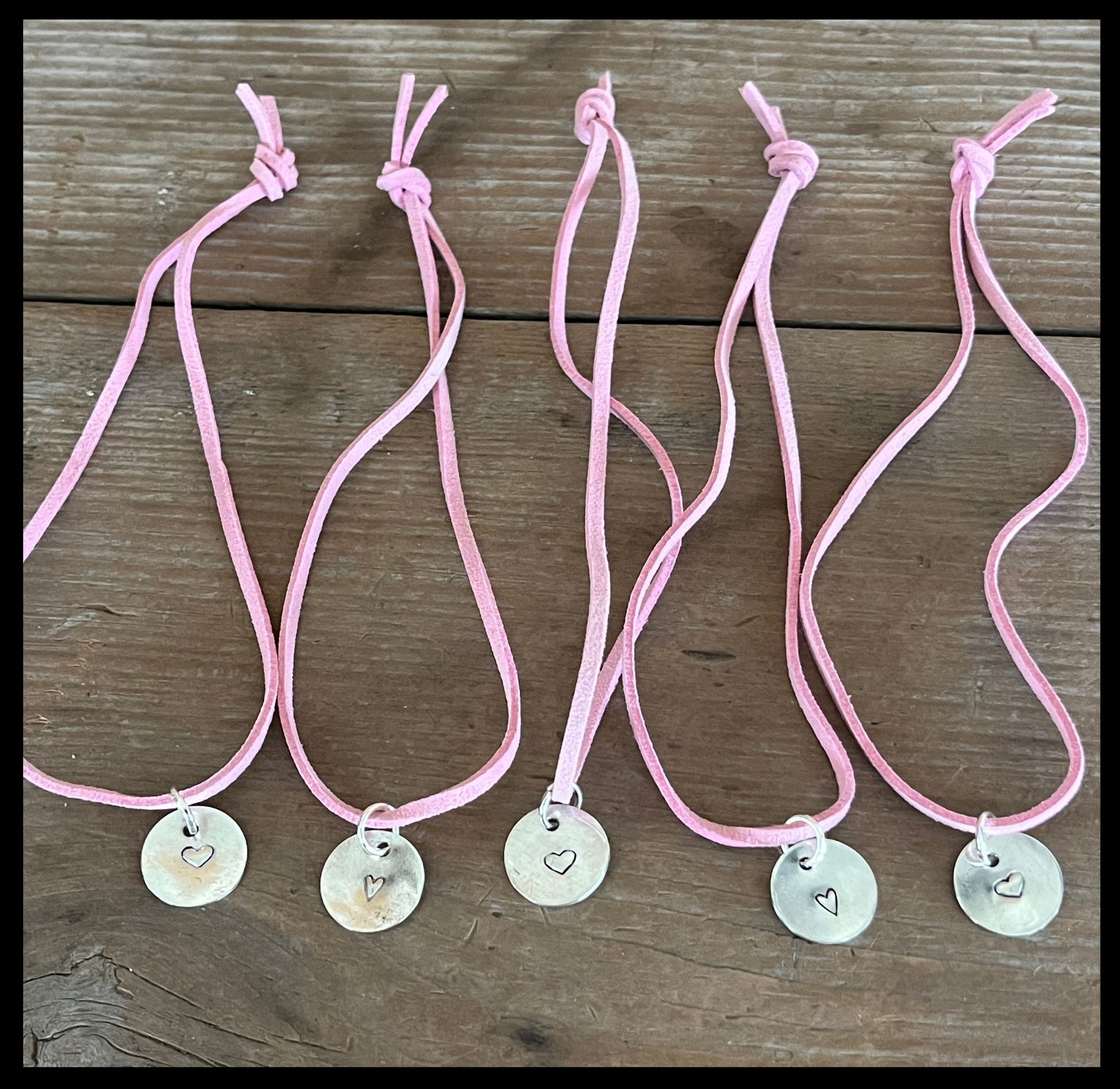 Each one hangs from a soft pink leather/suede tie you knot to whatever length feels right.