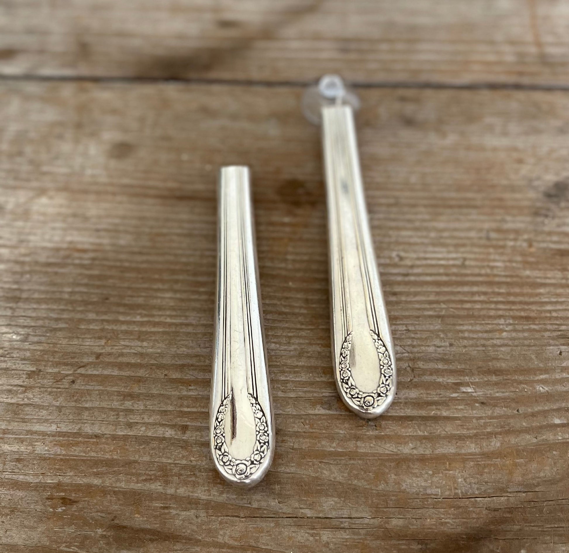 For all of our designs we choose wonderful authentic vintage/antique silverware. Once chosen, the pieces are modified and beautified by HAND; they are cut, drilled, filed and polished, etc. We do not cast/mold any of our designs, they are all handmade, one-of-a-kind creations. All of our creations are handmade - as such no two items are exactly alike.