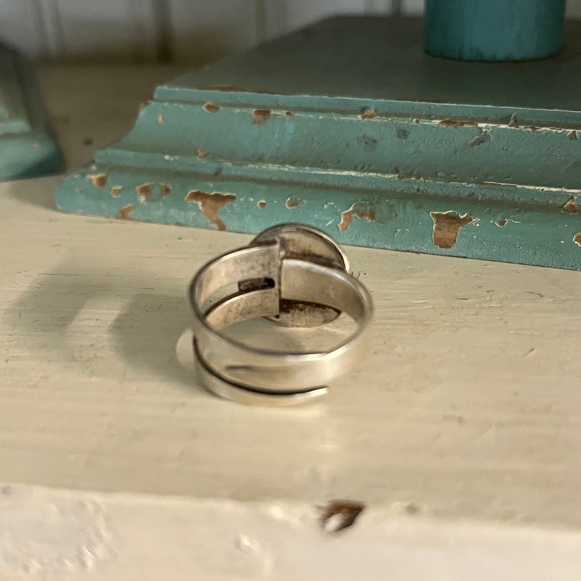 This super cool statement ring is made from a spoon and a fork. This two top dots were made from spoon bowls. The shank was made from several fork tines.