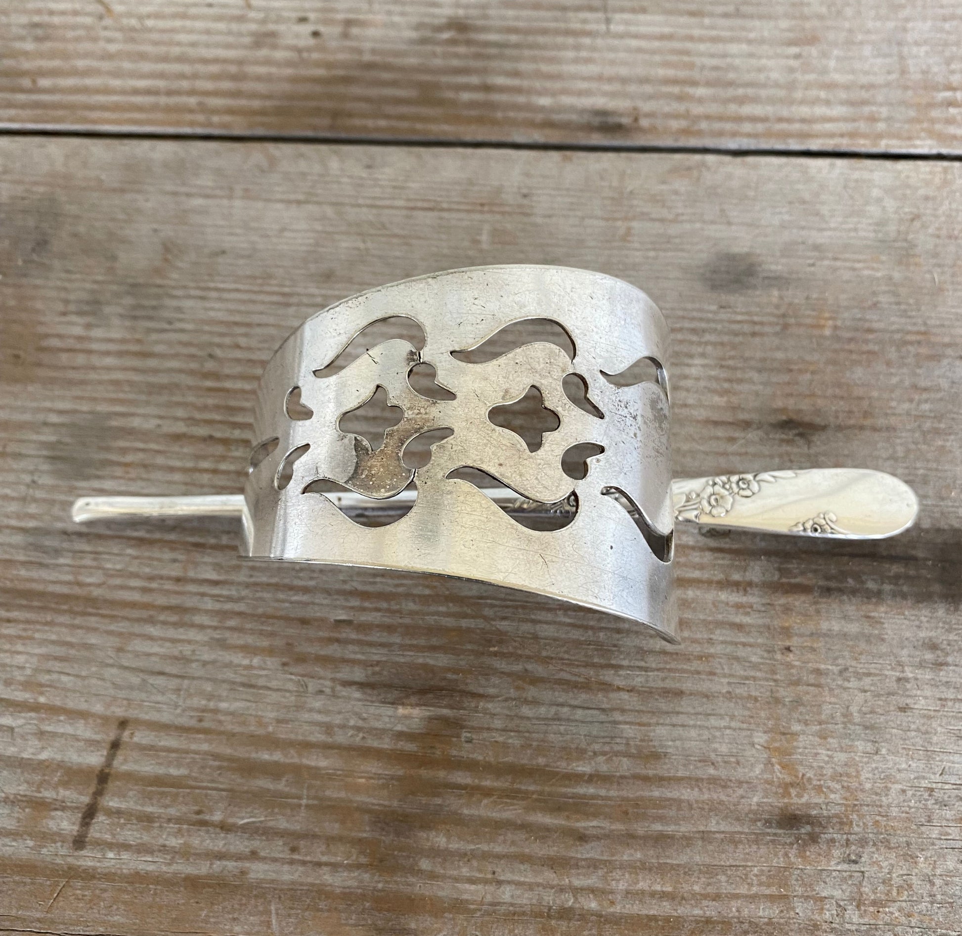 This gorgeous hair stick barrette is made from an vintage cake server that has its handle removed and is bent into this half moon shape. The stick portion is made from a vintage iced tea spoon. Notice the beautiful punched design on this barrette so that your hair can be visible through the piece when worn.