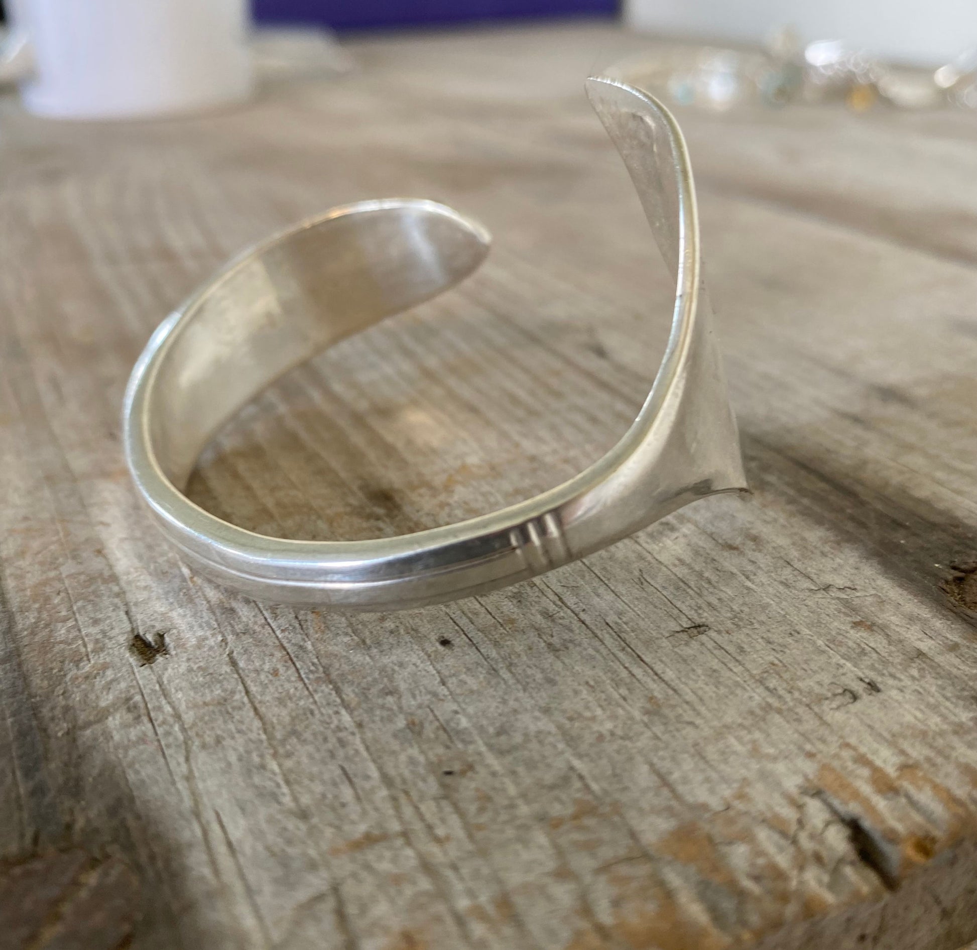 This handmade spoon bracelet we call a Mermaid Soul spoon cuff bracelet. Handmade with a unique tail fin at one end this bracelet is made from an upcycled antique spoon. Every part of this piece is handmade. We carefully select a gorgeous spoon from our inventory, then prep and cut the tail fin. Once the essential tail fin is created, the piece is hand stamped with "Mermaid Soul". We then hand-bend the piece before we buff and polish the whole thing.