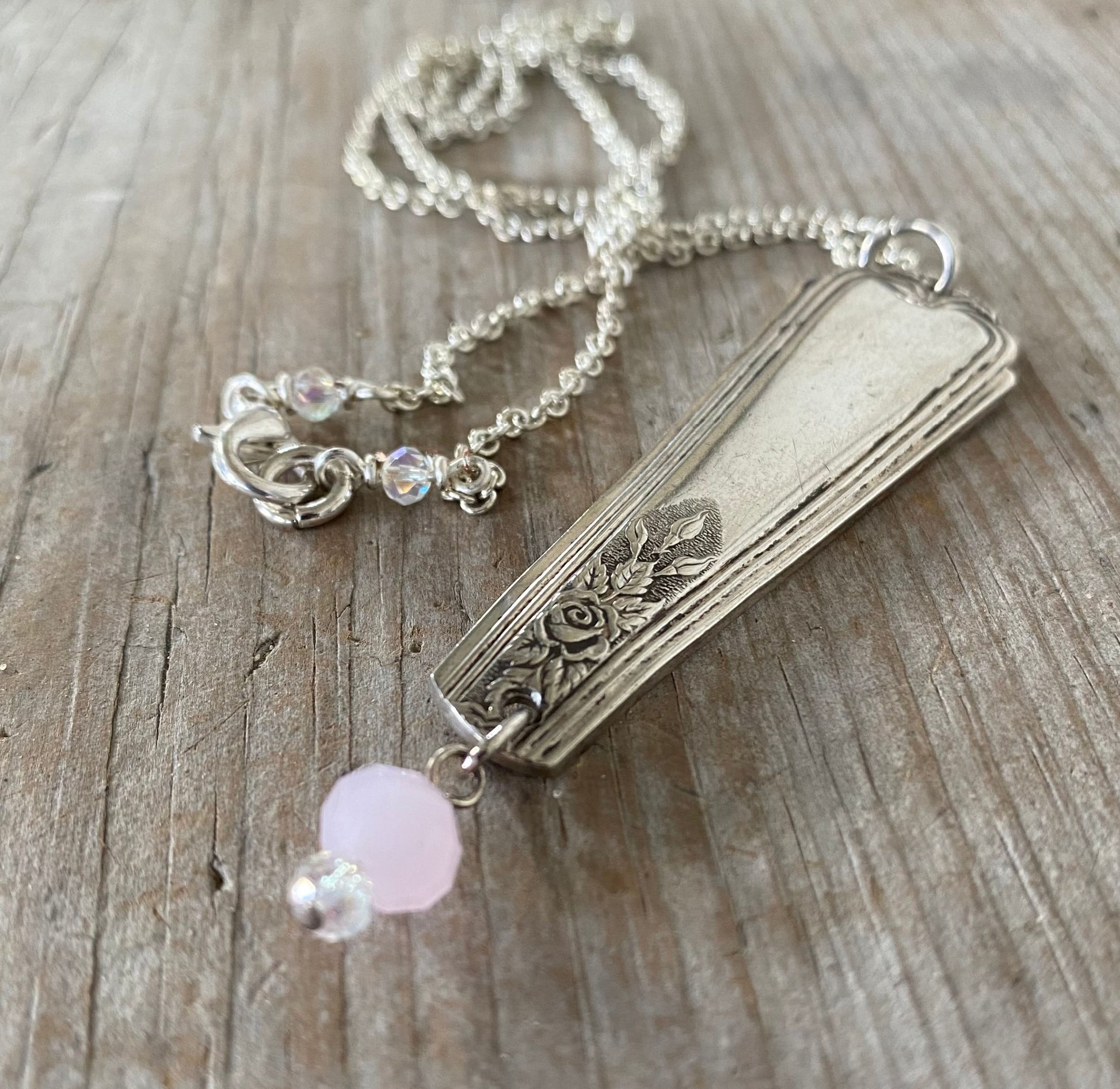 Silver spoon jewelry vertical bar necklace made from a vintage silverplate silverware handle. This beauty has an art nouveau feeling and is adorned with what looks like a Rose. The silverplate pendant is adorned with a pale pink Czech glass bead. Hangs from a silverplate chain that is adorned with small crystal beads.