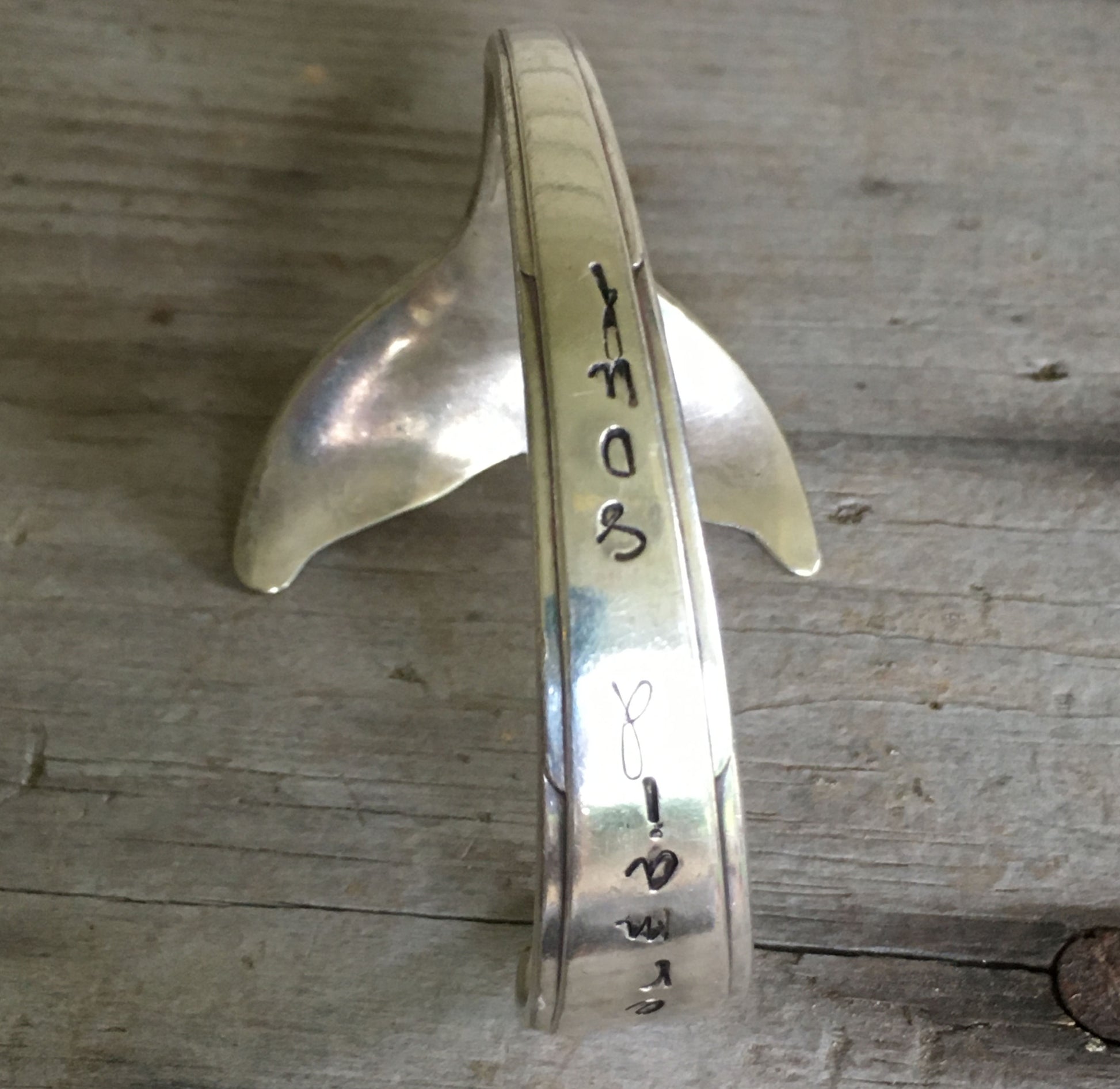 This handmade spoon bracelet we call a Mermaid Soul spoon cuff bracelet. Handmade with a unique tail fin at one end this bracelet is made from an upcycled antique spoon. Every part of this piece is handmade. And look at the feminine sensibility on the design of this spoon handle. We carefully select a gorgeous spoon from our inventory, then prep and cut the tail fin. Once the essential tail fin is created, the piece is hand stamped with "Mermaid Soul". We then hand-bend the piece before we buff and polish the whole thing. This particular piece of silverware was monogrammed with an "M" from which we stamped the remainder of the phrase "Mermaid Soul".