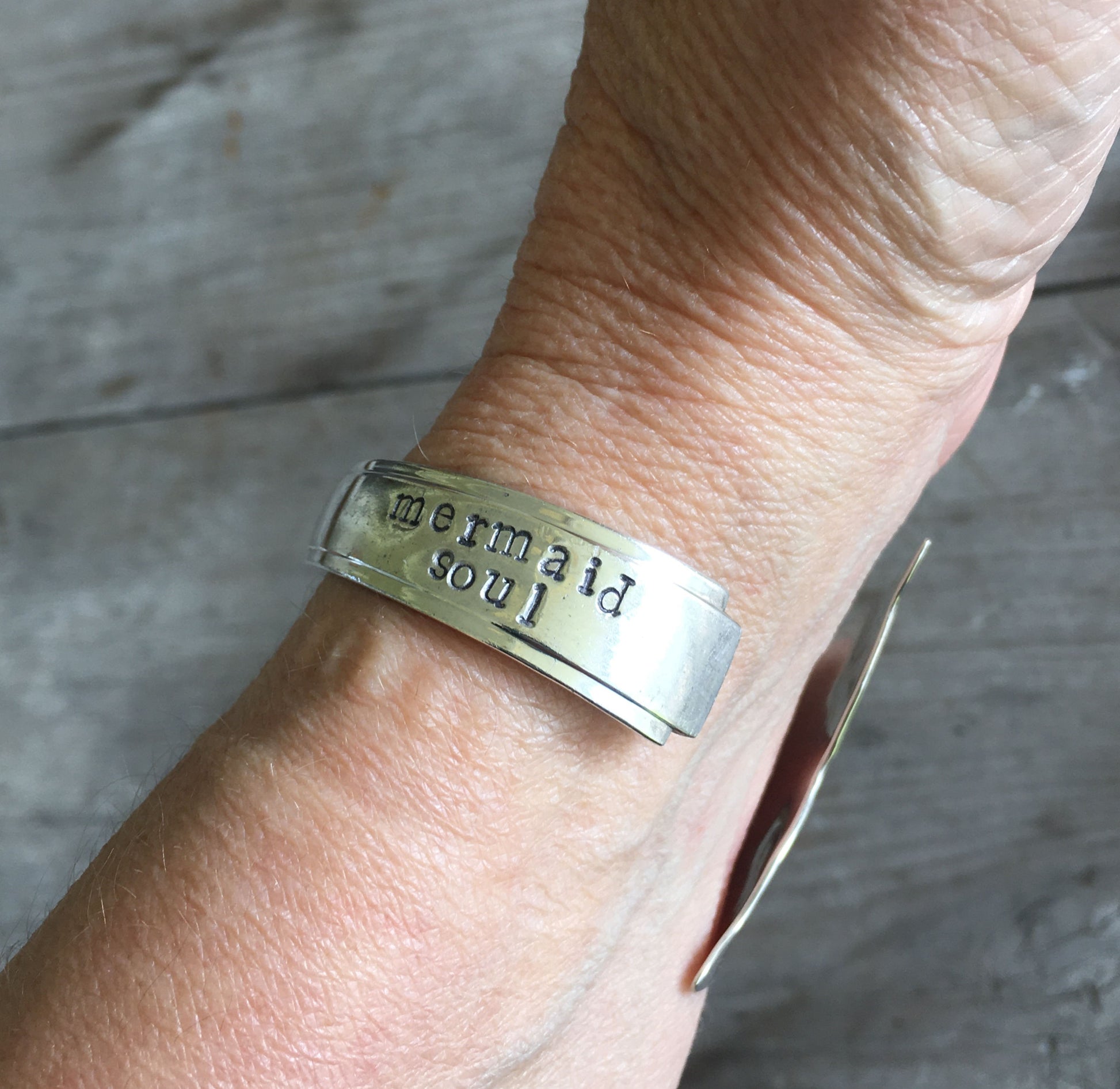 This handmade Mermaid Soul spoon cuff bracelet, with a tail fin, is made from an upcycled vintage spoon. Every part of this piece is handmade. We carefully select a gorgeous spoon from our inventory, then prep and cut the tail fin. Once the essential tail fin is created, the piece is hand stamped with "Mermaid Soul". We then hand-bend the piece before we buff and polish the whole thing.
