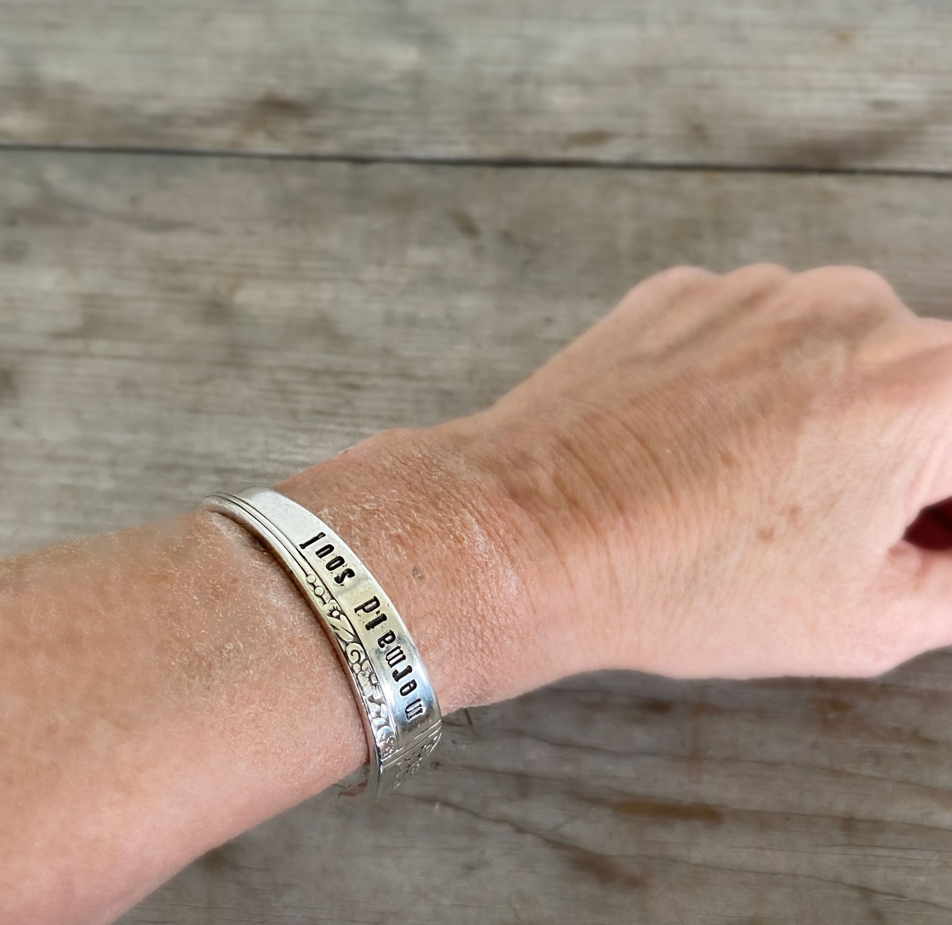 This handmade Mermaid Soul spoon cuff bracelet, with a tail fin, is made from an upcycled vintage spoon. Every part of this piece is handmade. We carefully select a gorgeous spoon from our inventory, then prep and cut the tail fin. Once the essential tail fin is created, the piece is hand stamped with "Mermaid Soul". We then hand-bend the piece before we buff and polish the whole thing.