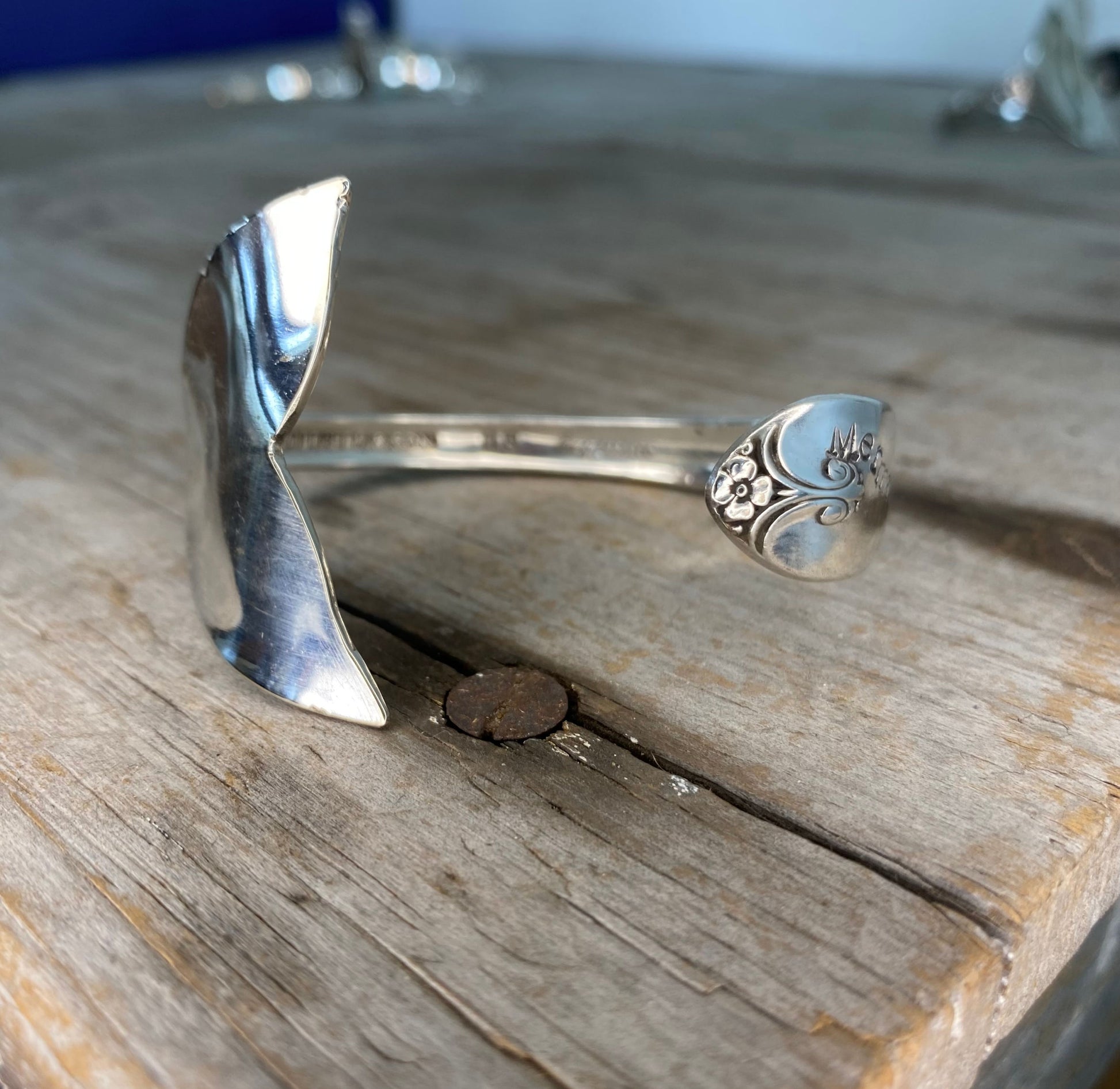 This handmade Mermaid Soul spoon cuff bracelet, with a tail fin, is made from an upcycled vintage spoon. Every part of this piece is handmade. We carefully select a gorgeous spoon from our inventory, then prep and cut the tail fin. Once the essential tail fin is created, the piece is hand stamped with "Mermaid Soul". We then hand-bend the piece before we buff and polish the whole thing.