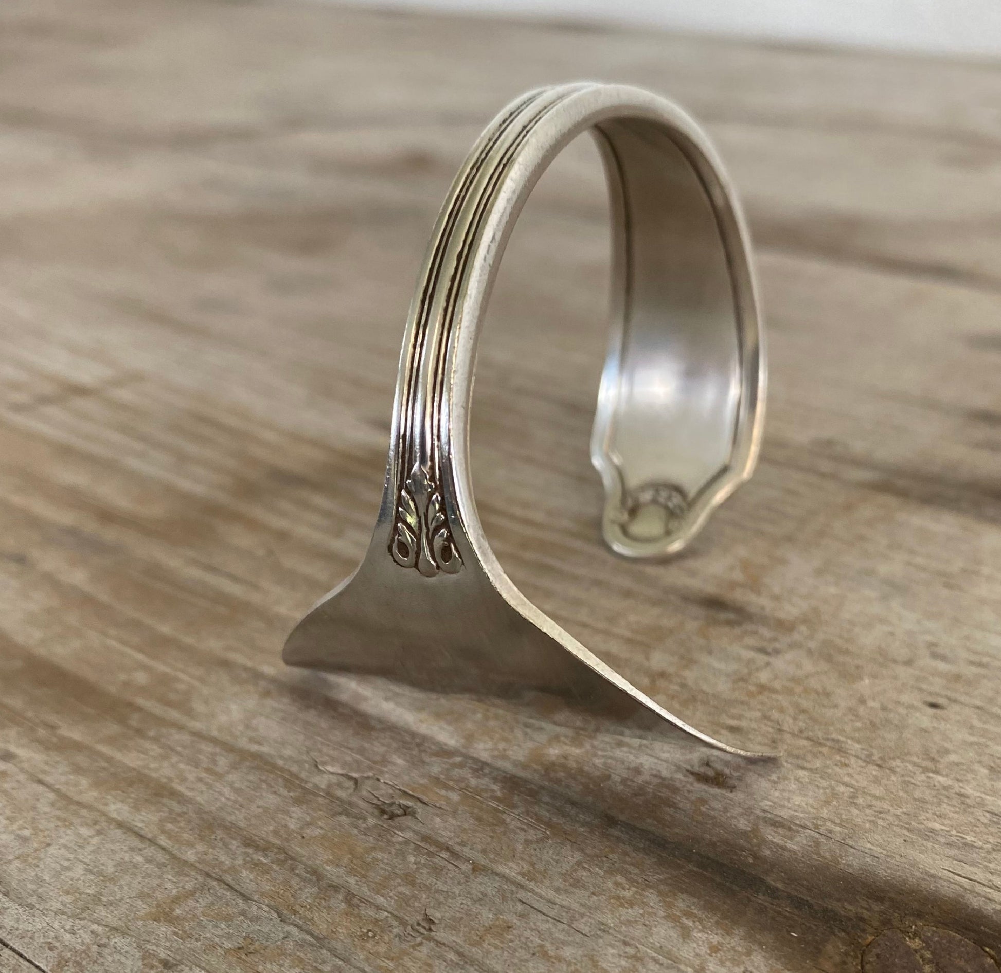 This handmade Mermaid Soul spoon cuff bracelet, with a tail fin, is made from an upcycled vintage spoon. Every part of this piece is handmade. We carefully select a gorgeous spoon from our inventory, then prep and cut the tail fin. Once the essential tail fin is created, the piece is hand stamped with "Mermaid Soul". We then hand-bend the piece before we buff and polish the whole thing.