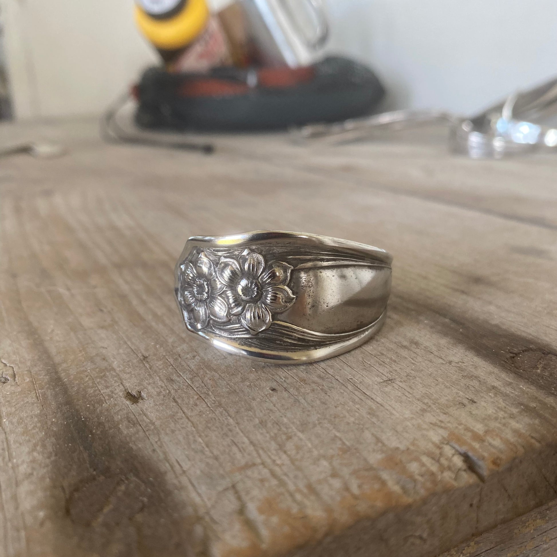 This spoon cuff bracelet is JUST.SO.PRETTY.! With a deep relief design of daffodils on he outside as well as the inside of the bracelet. A classic art nouveau piece that is proud and stately on its own.