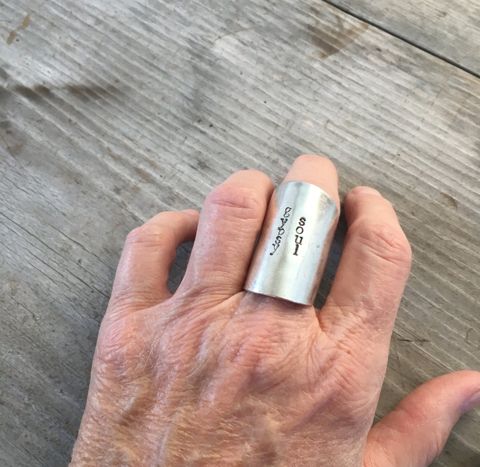 For a free spirit look, this spoon bowl cuff ring can be worn alone or with a smattering of other silver jewelry. This spoon ring is made from the bowl portion of the spoon. Prior to being bent into a long cuff ring, this spoon bowl was stamped with GYPSY SOUL.
