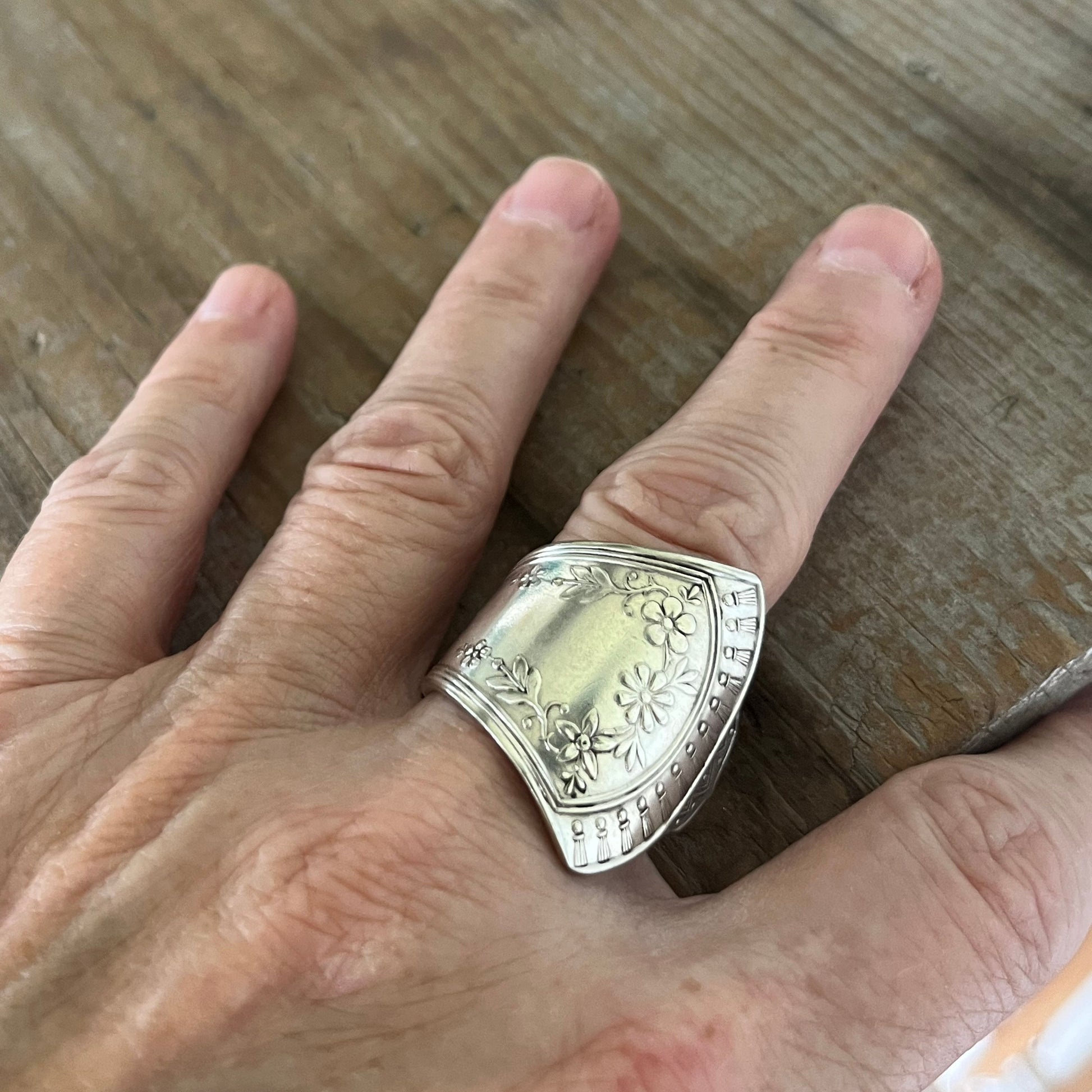 Oh my word, check out this gorgeous unique spoon ring. This ring is made from a large handle of a serving spoon. This piece is classic late 1800s Eastlake style featuring geometric lines and shapes along with themes of nature like flowers, all with a slight east asian influence.