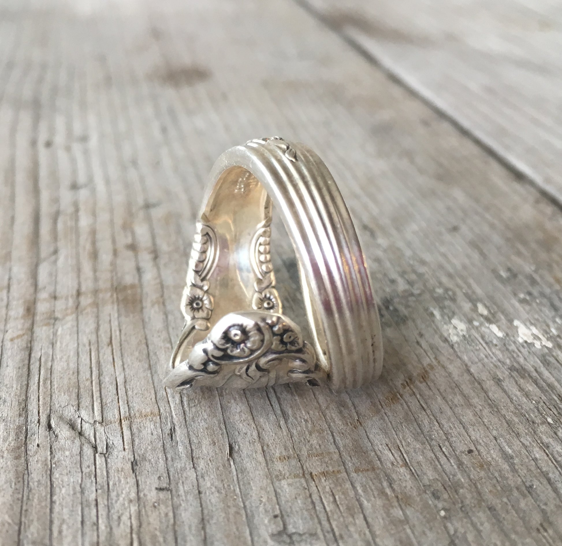 This is an enchanting coil wrap spoon ring. Enchanting indeed as the pattern name for the spoon from which this was made is Enchantment. The pattern has a lovely mirror-like center that is surrounded my a deeply cut floral design.