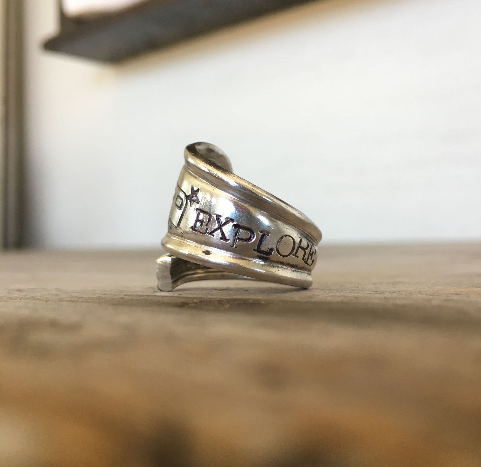 This EXPLORE Spoon Ring is upcycled from a spoon handle. Made in the coil wrap style, this spoon ring is sure to inspire! The open panel portion of the original spoon design, we've hand stamped a Forest-scape and the word EXPLORE. Enjoy this one-of-a-kind artisan spoon ring.