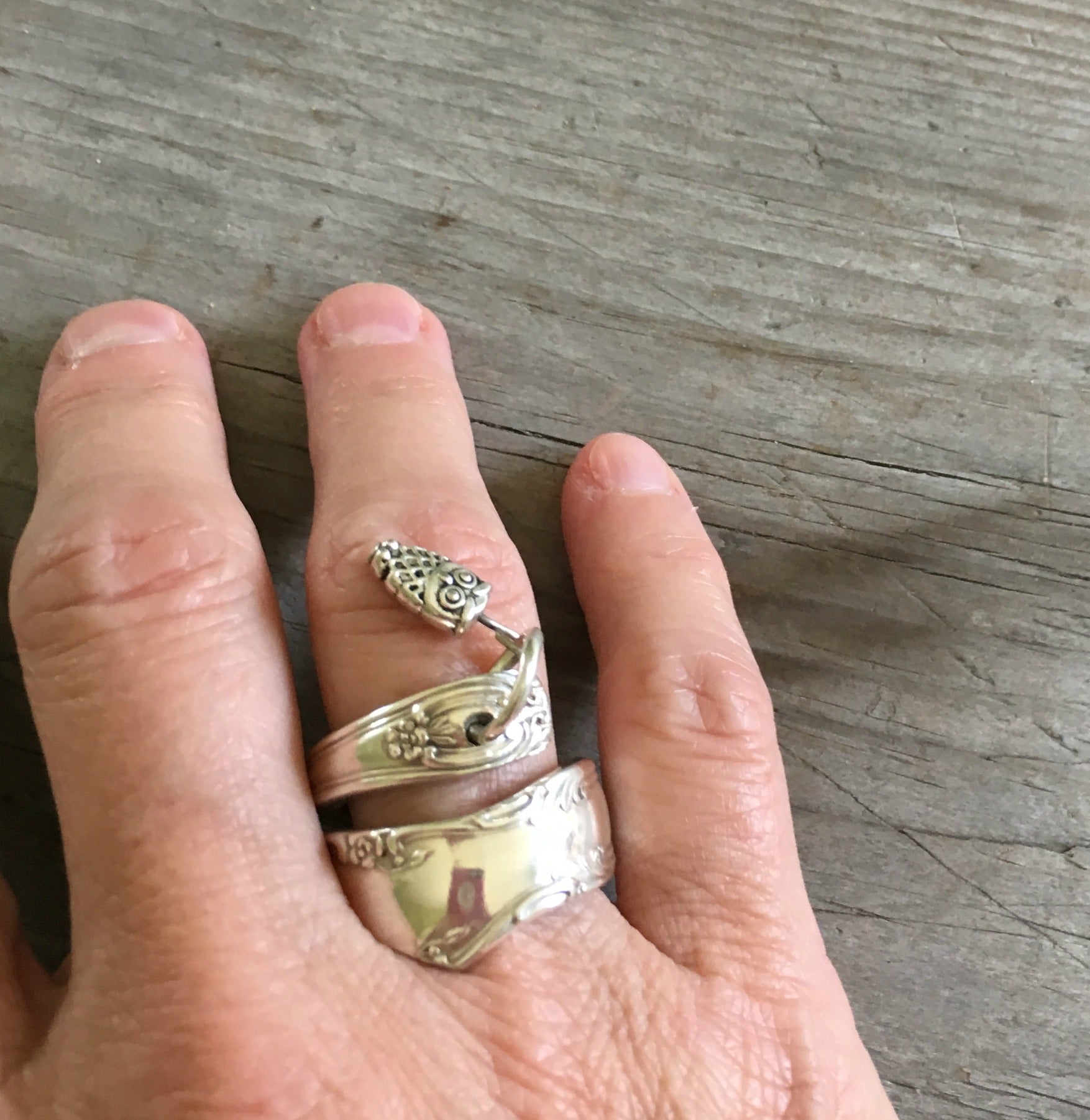 We really don’t let anything go to waste. This beauty was brought out from the scrap bin and given a funky unique new life in this coil wrap ring with an owl charm hanging from it. Very unusual – you want see this anywhere else.