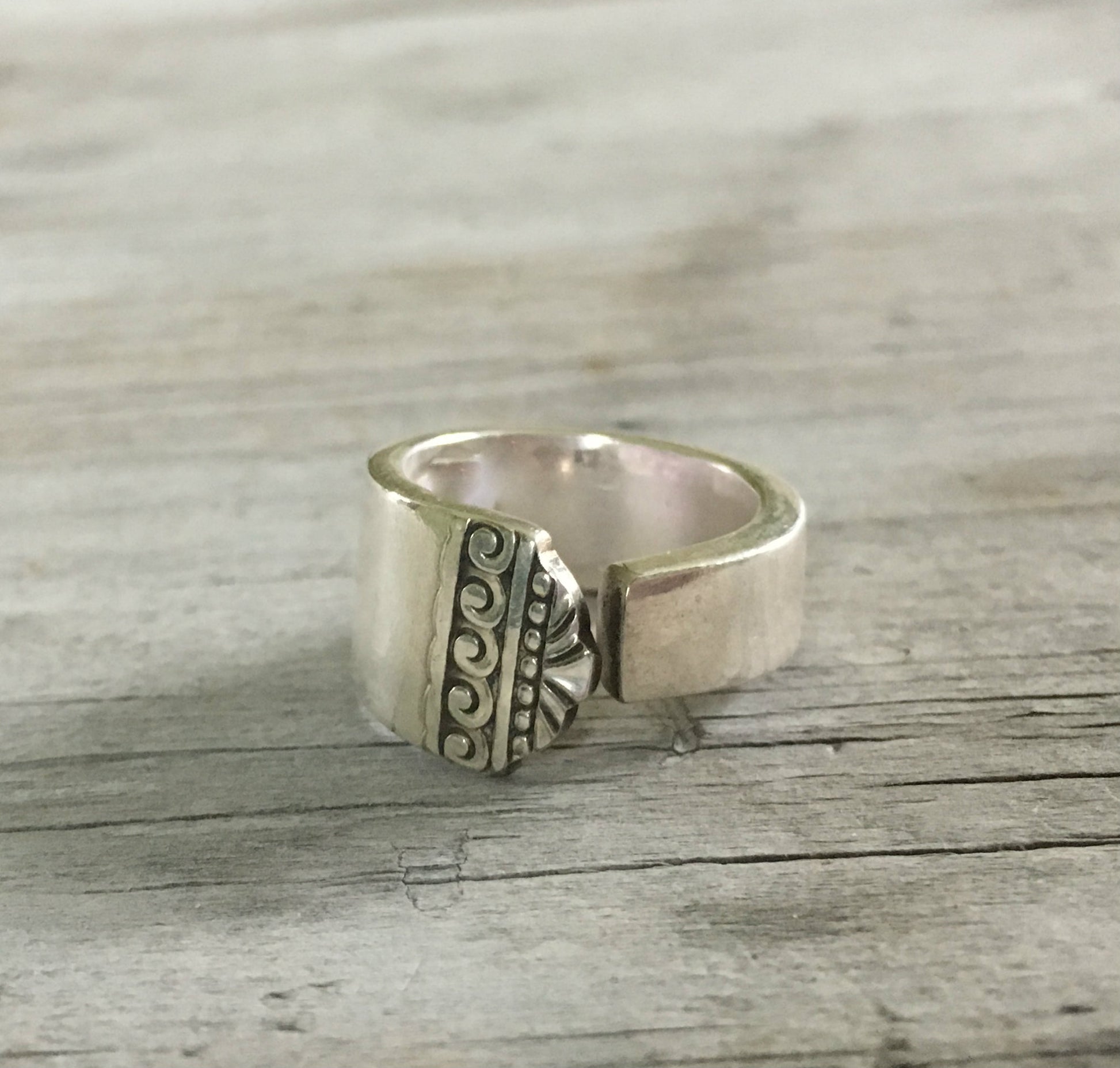 This spoon ring has a calm and quiet beauty to it with its classic pattern that represents waves of the ocean. This spoon ring is made from the end portion of the handle of a vintage silverplate spoon and is one of the prettiest designs!
