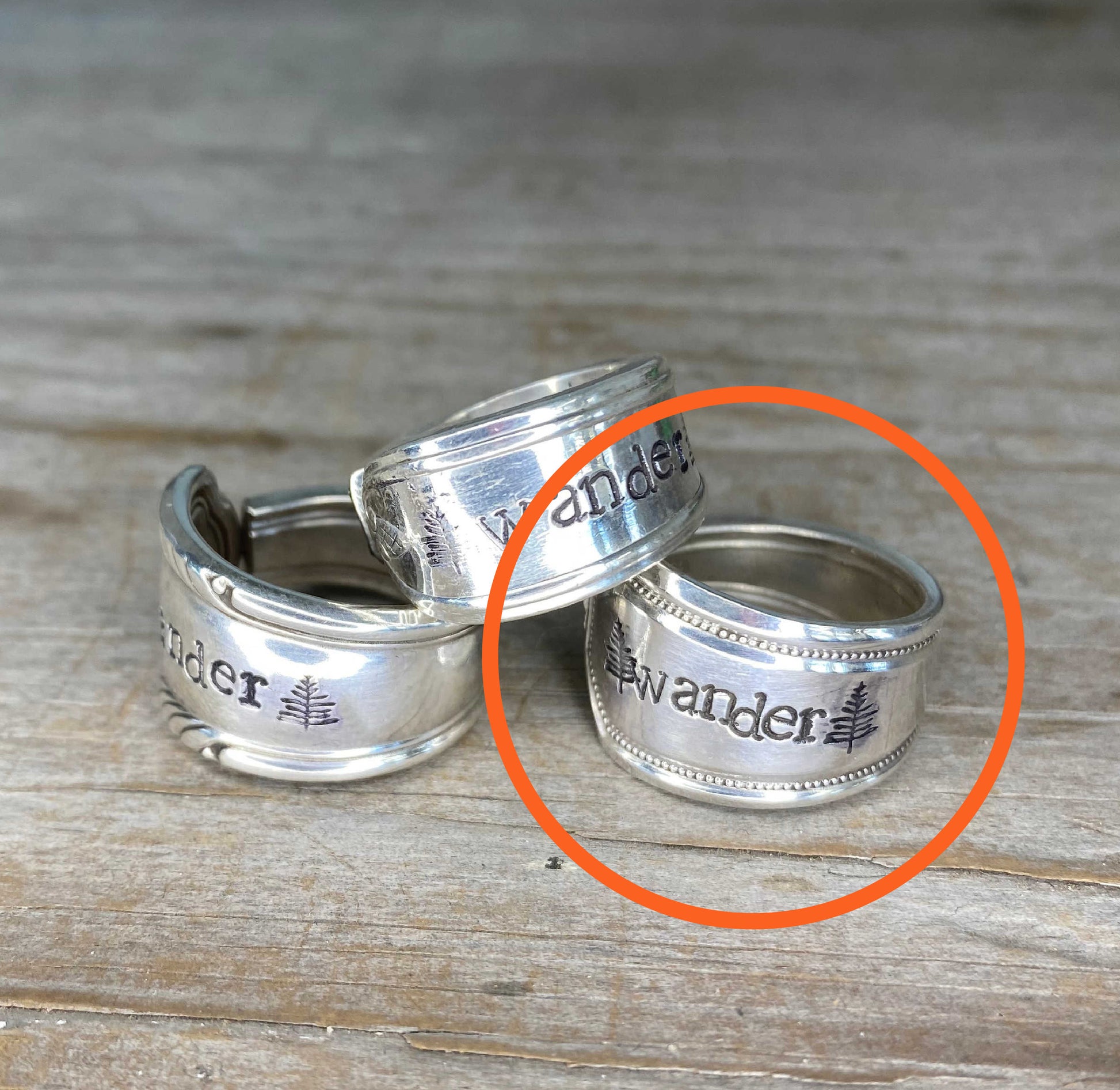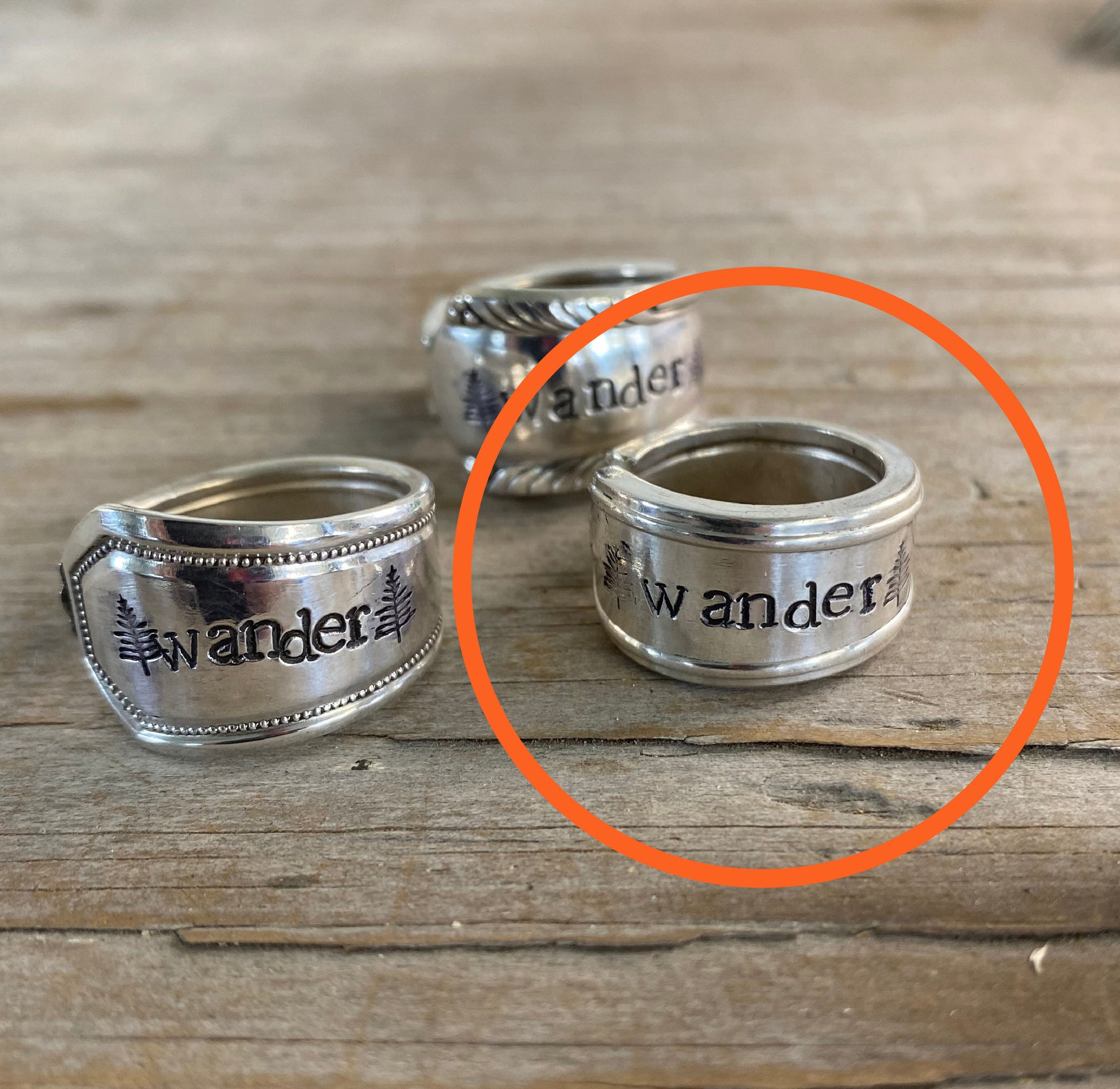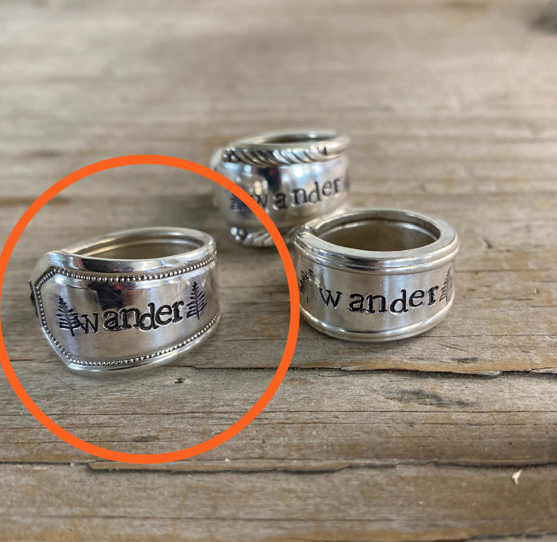 This WANDER spoon ring is crafted from an upcycled spoon handle, transformed into a tiny tribute to adventure. In the open panel of the original design, we hand‑stamped “WANDER” between two evergreen trees — a nod to trails, tall pines, and the call of the wild. Each ring is one‑of‑a‑kind, and while the stamping stays (mostly) the same, the silverware pattern you receive will vary based on our current vintage stock. A perfect piece for the free‑spirited explorer at heart.