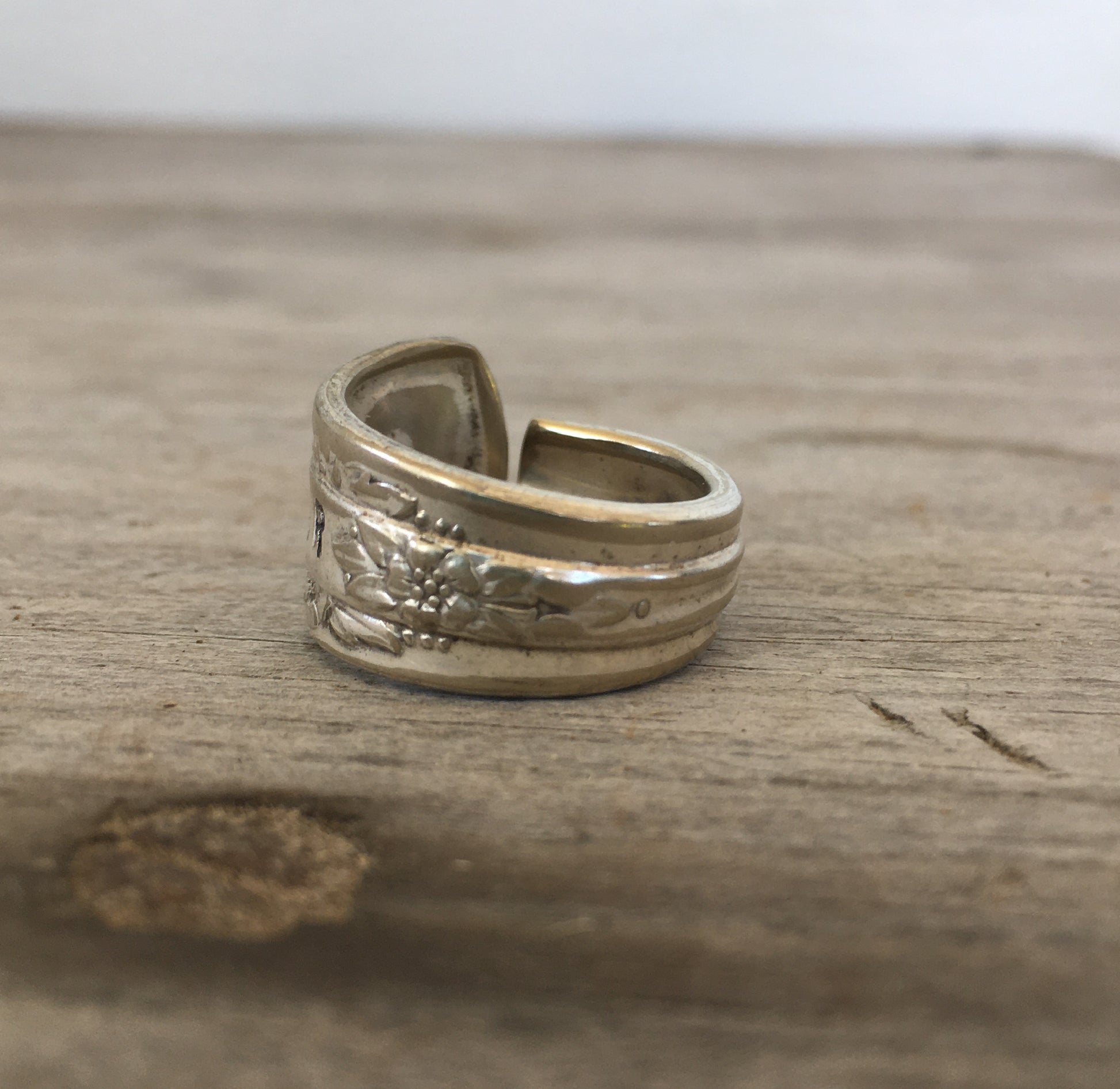 This upcycled spoon ring is made from a sweet vintage silverware spoon handle. A sweet array of flowers flanks the border of the handle as well as a spray of a flowers in the middle. It is hand stamped with the word WANDER.
