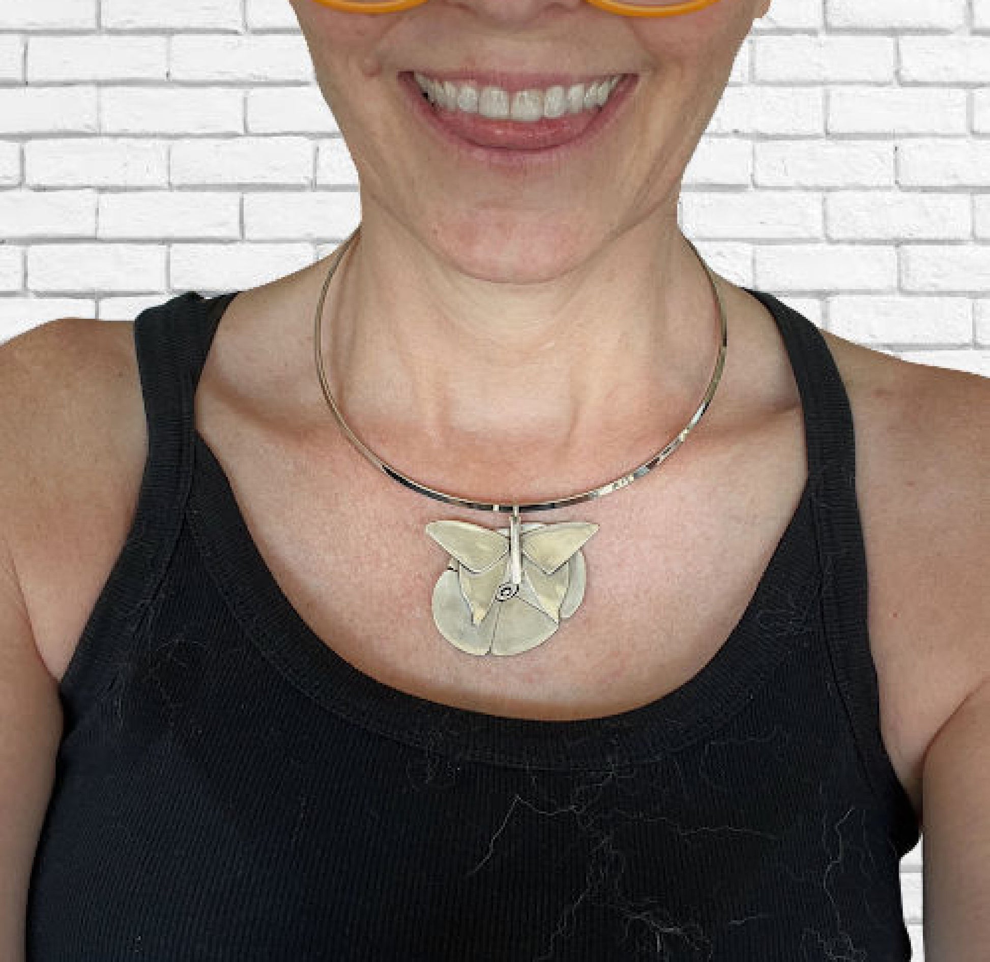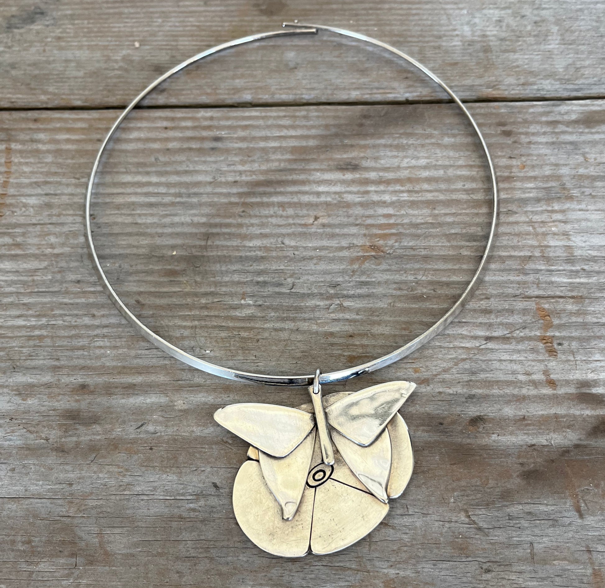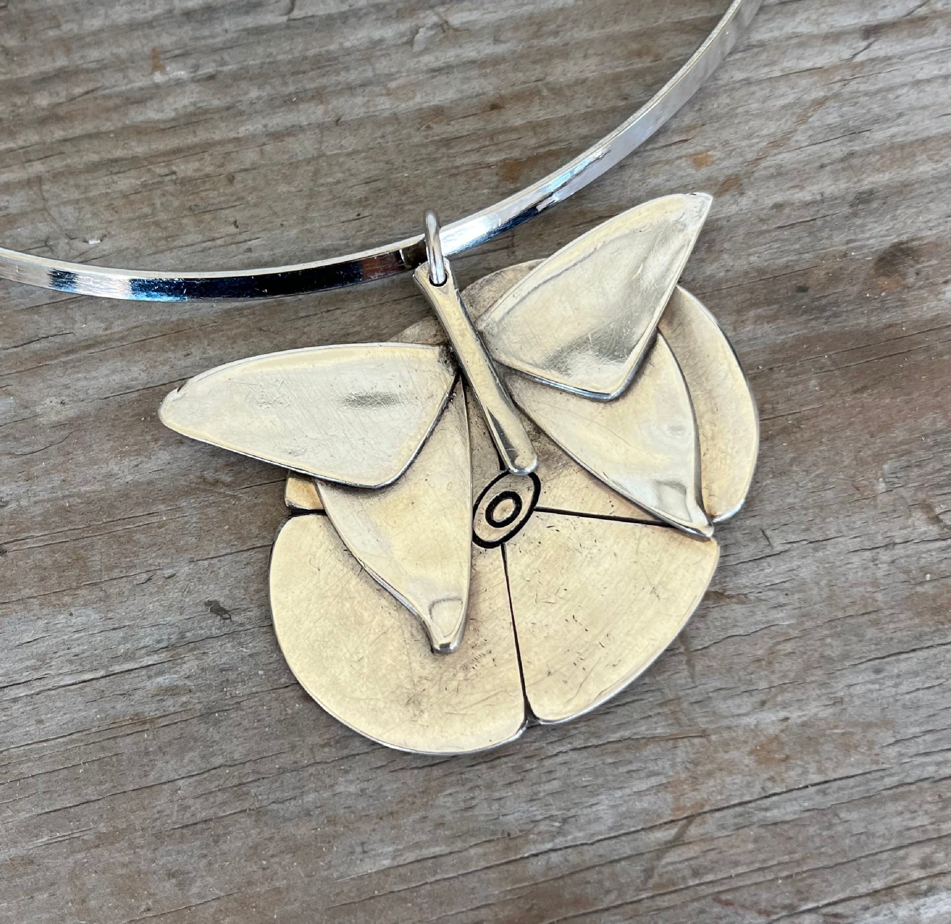Feel free to swoon over this gorgeous sterling silver spoon bowl butterfly on flower pendant necklace. Ingenious in design, this necklace is comprised of the contoured halves of spoon bowls from a vintage sterling silver spoon that was used in other projects. The body of the butterfly is made from the neck of the spoon as well. The flower that the butterfly sits on is also made from a single sterling spoon bowl. Hangs from a silverplate cuff necklace.