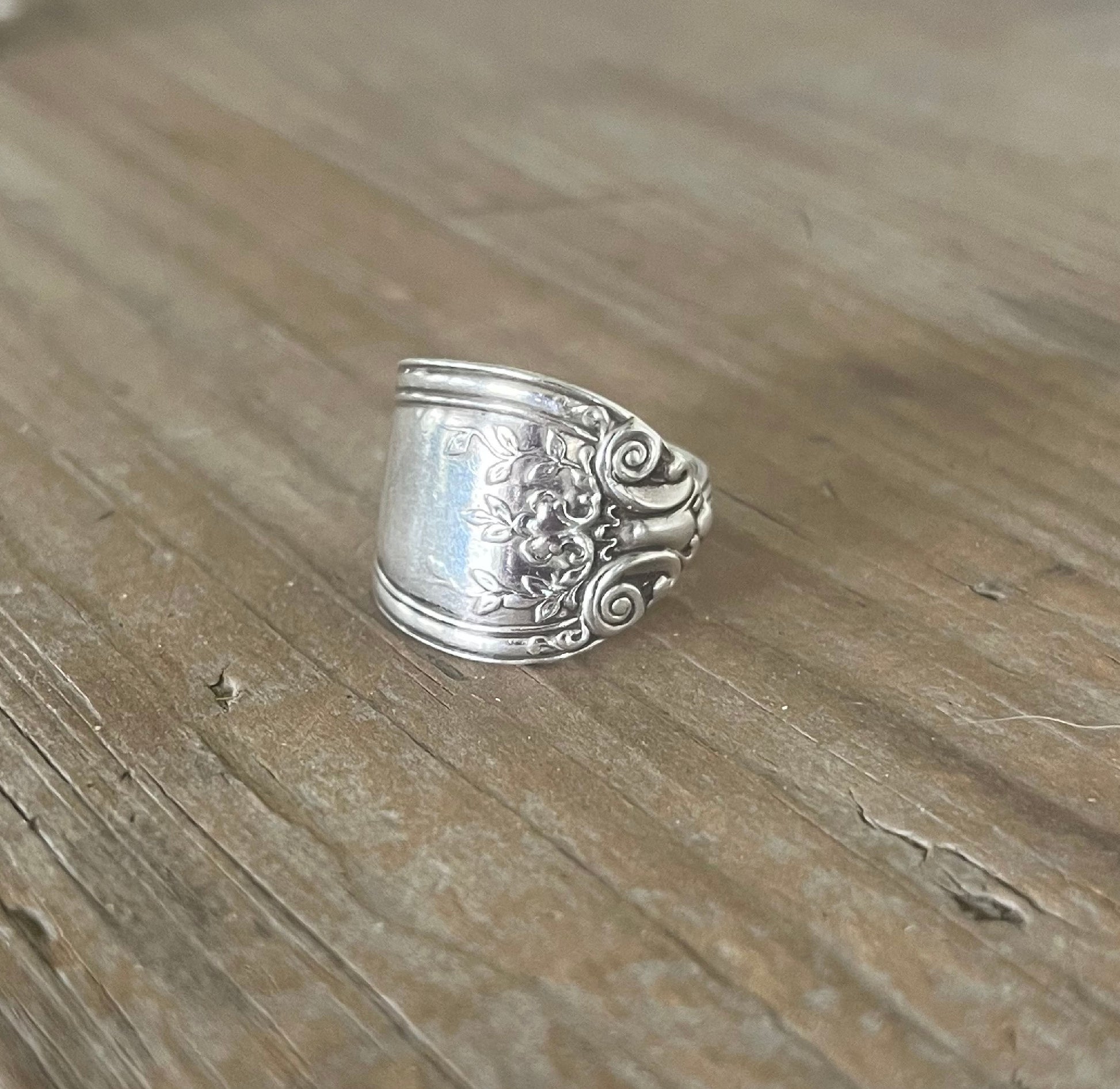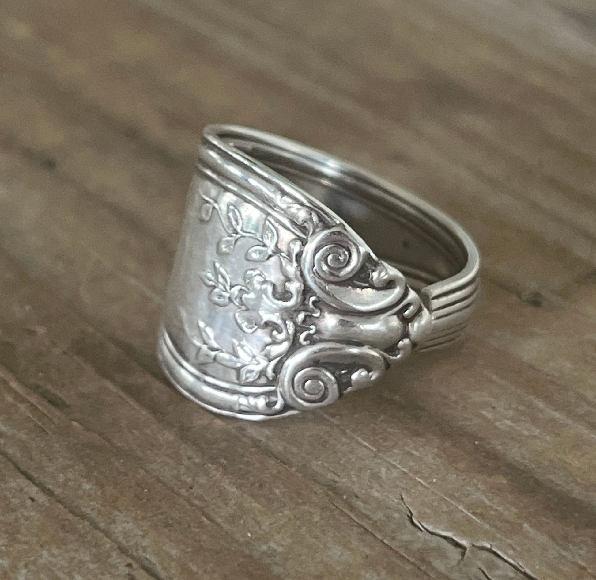 Such a beautiful sterling silver spoon ring. A gorgeous design that makes me think of a garden trellis with scroll woodwork at the top from which hanging vines grow downwards. The design is also on the inside of the ring.