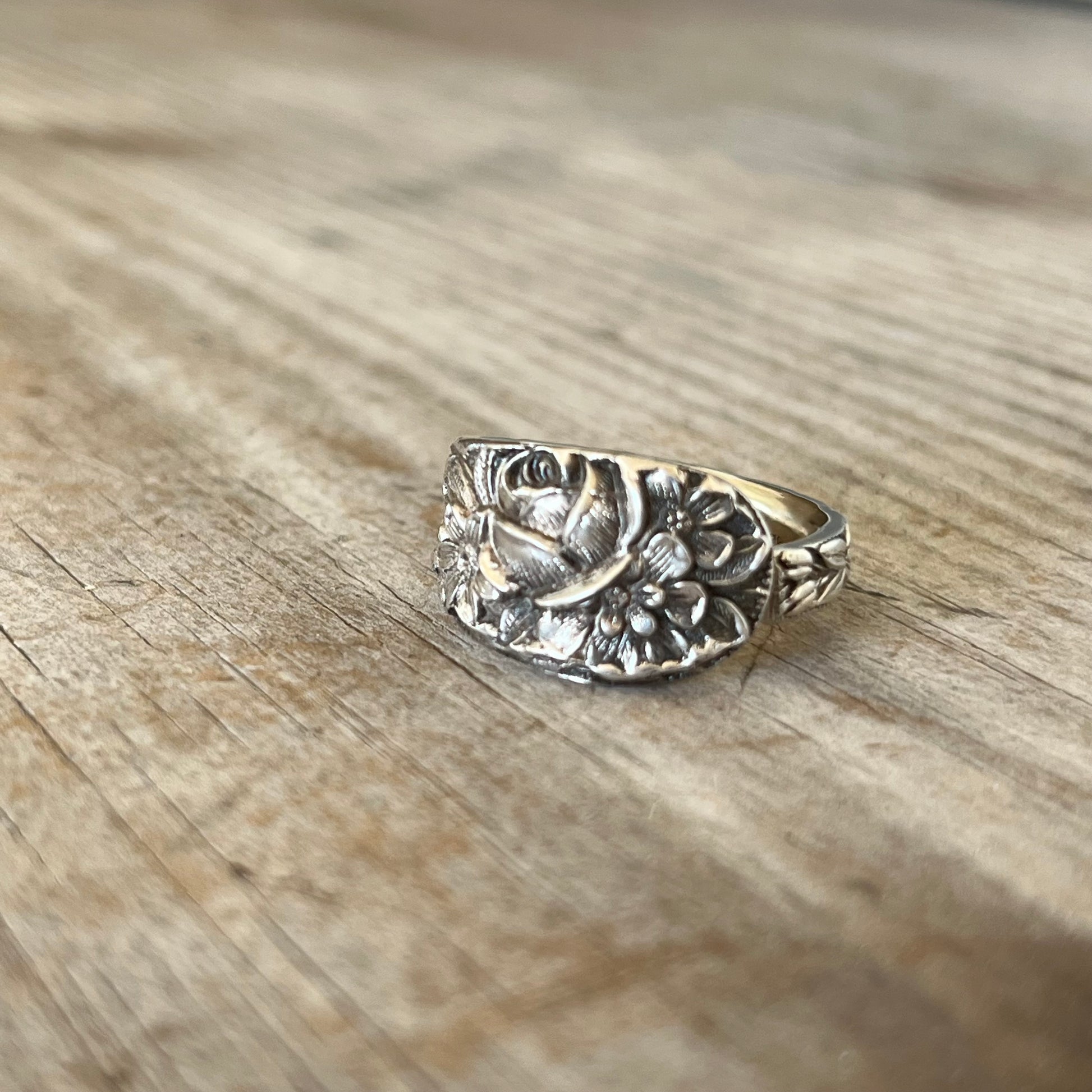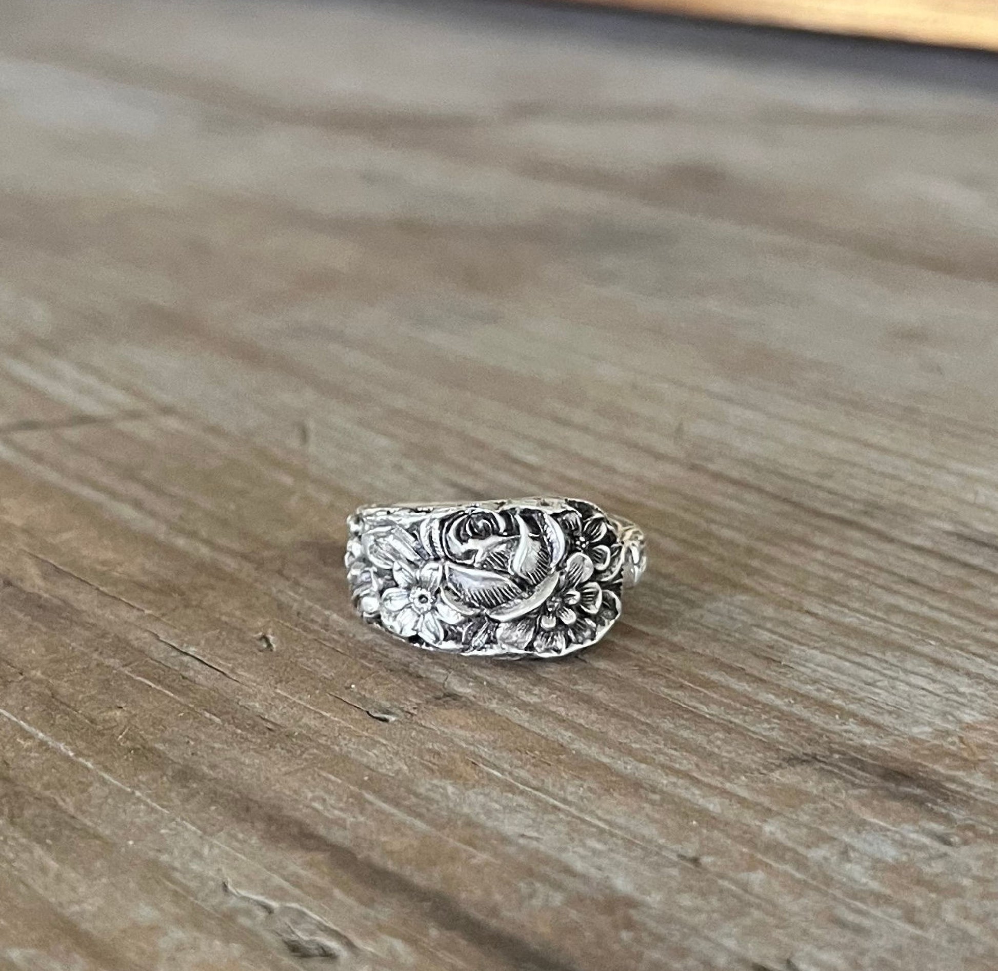 This stunning full design sterling silver spoon ring is made from a Kirk & Son antique demi-tasse spoon. The detail of this design is beyond comprehension: the floral design just goes on forever. This ring has a wonderful weight and warmth due to the sterling silver. There is an old English monogram on the inside.