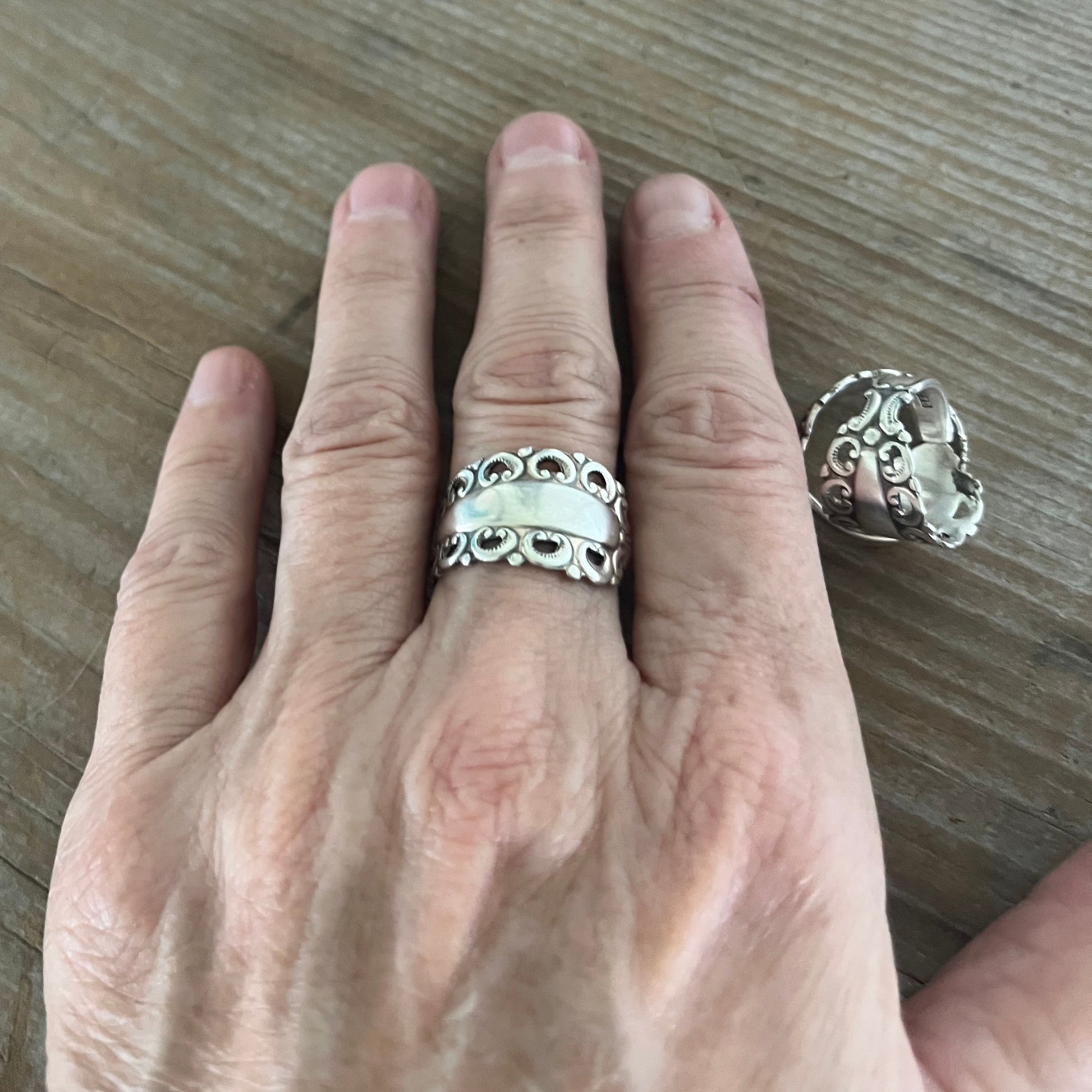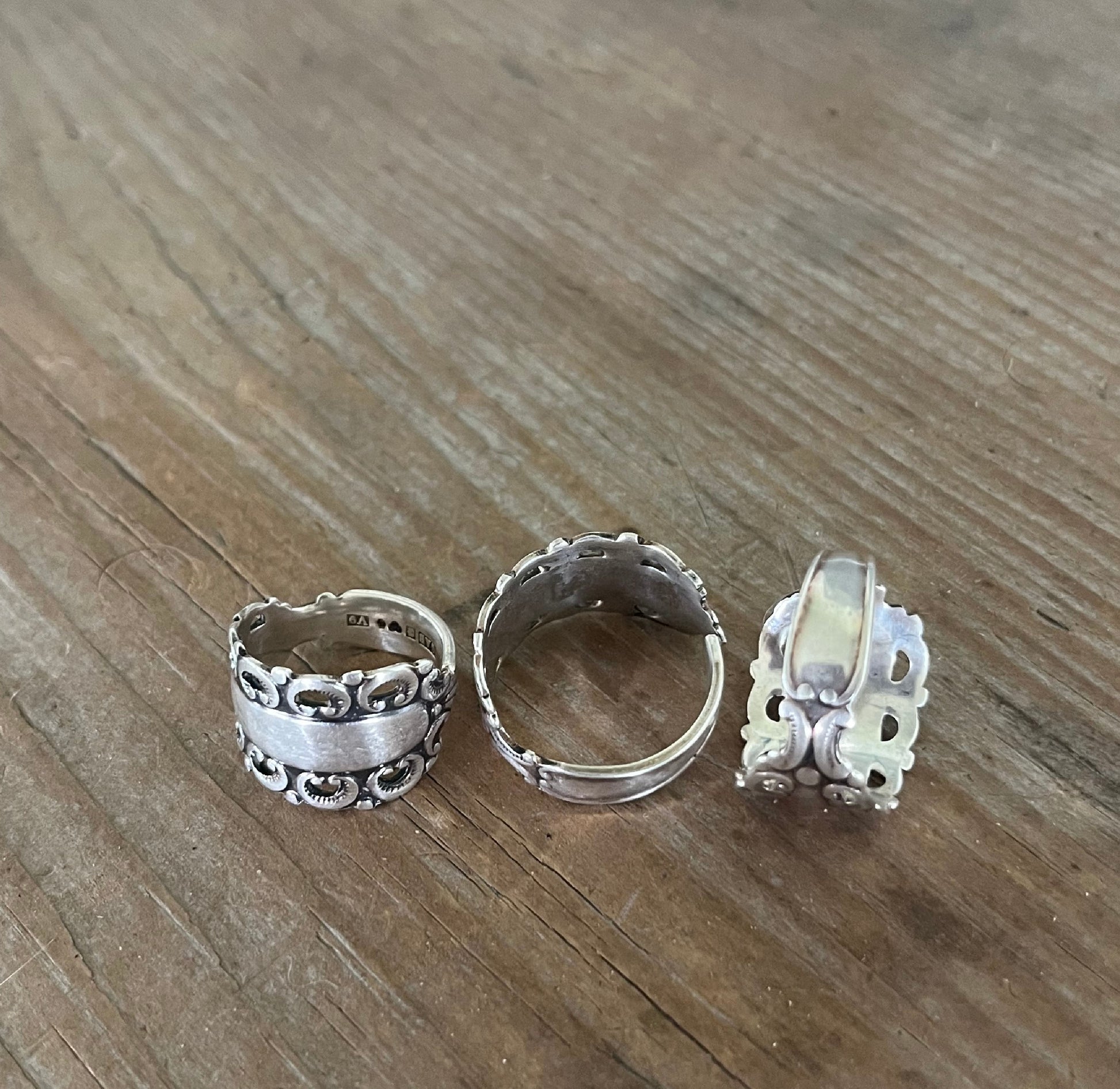 Check out these beauties - sterling spoon rings from Swedish demi-tasse spoons. These are made by GAB Silversmiths and have such a fun and modern design. I cannot verify the age on these pieces, but my instinct says ca. 1980s. Regardless of age, the design is simply timeless with scrolly openwork on the edges around a smooth center panel.