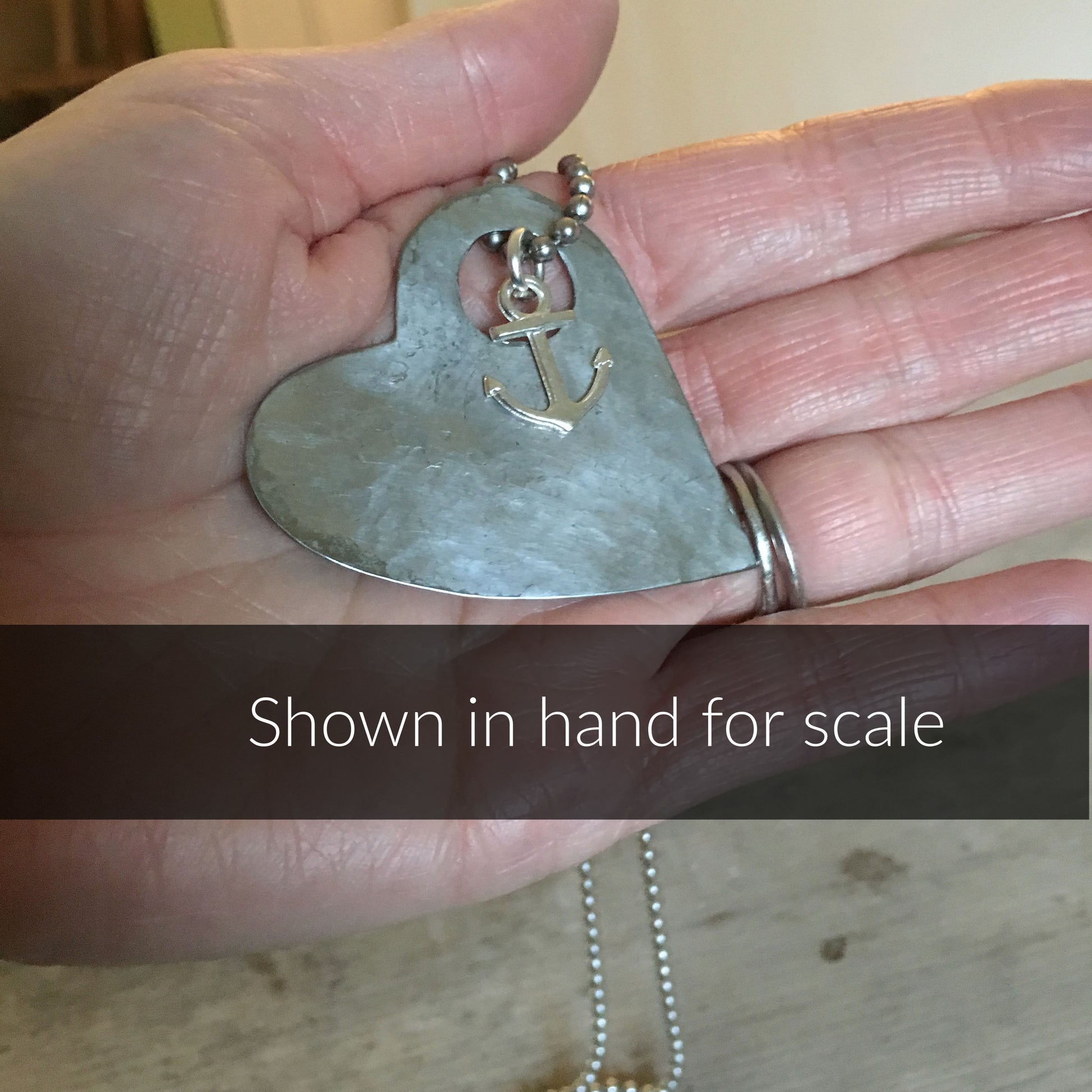 This stylized heart necklace, made from an upcycled spoon bowl, has a quirky, whimsical fun vibe to it. An oversized hole, that is drilled for the chain to go through, adds further whimsy to the piece. The heart is handmade from the bowl of a large silverplate serving spoon. The whole piece was hand cut from the bowl and then hole punched. Once all the edges were sanded and buffed, the piece was hammered to give it this fun texture. The necklace hangs from a vintage ball chain and adorned with an anchor charm.